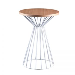 • Mesa auxiliar redonda con sobre chapado en ROBLE natural con apertura para depositar objetos en el interior. Estructura de metal BLANCO.