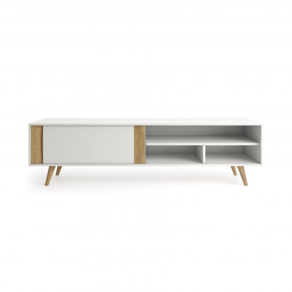 Mueble TV lacado blanco combinado con madera.