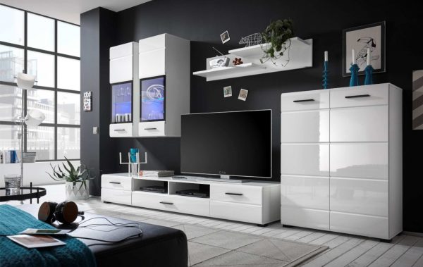 Composición de 285 cm. de longitud. Tablero de melamina aglomerado de color blanco. Frontal en MDF con vinilo de PVC blanco brillo. Grosor del tablero: 16mm. Servido en KIT.