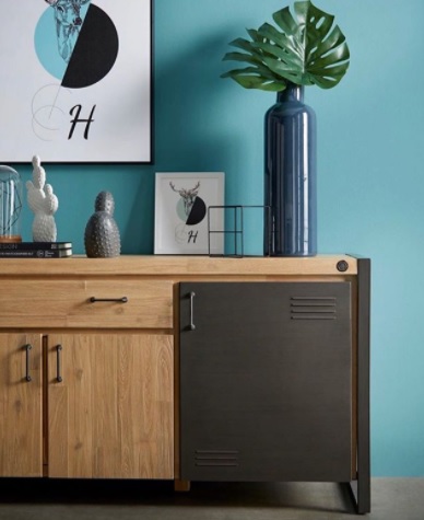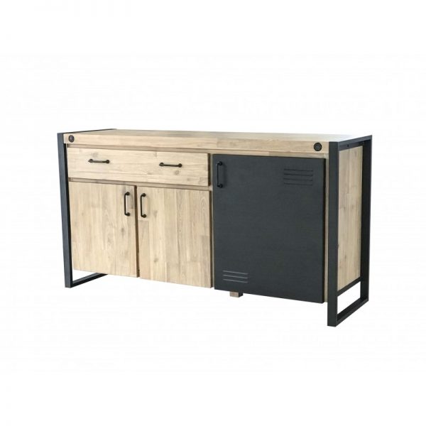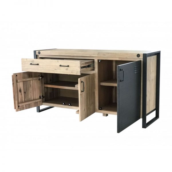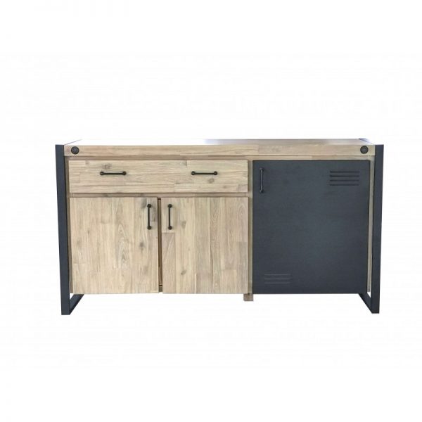 Aparador diseño industrial donde se combina la madera maciza de acacia con el metal, tanto en la estructura del mueble como en la puerta. Tapa del aparador efecto grueso 50mm. con tuerca metal efecto industrial. guías de cajones metálicas.