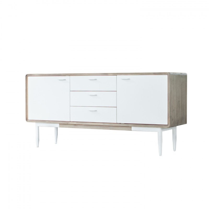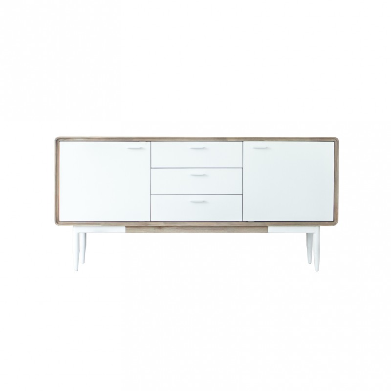 Aparador de línea actual fabricado en madera maciza de acacia y con los frentes en DM lacado blanco. Gran capacidad con 2 puertas y 3 cajones. Puertas con cierre suave y guías metálicas en cajones. Patas metálicas blancas.