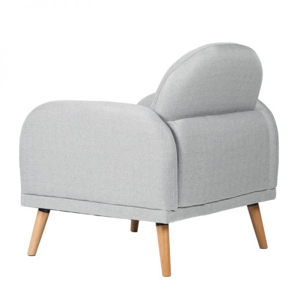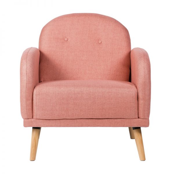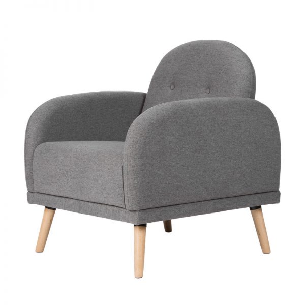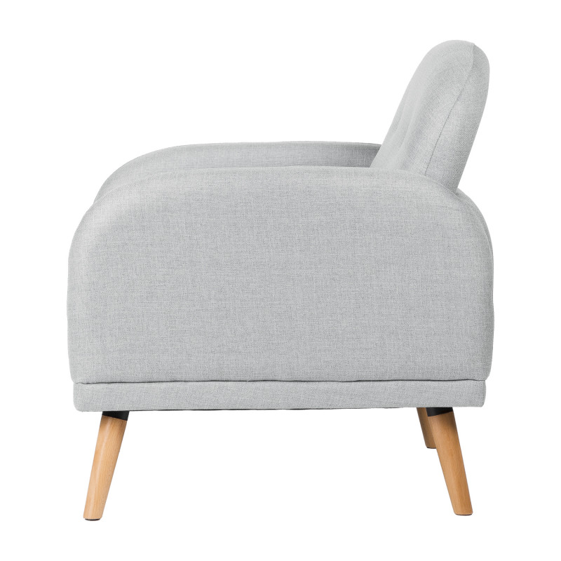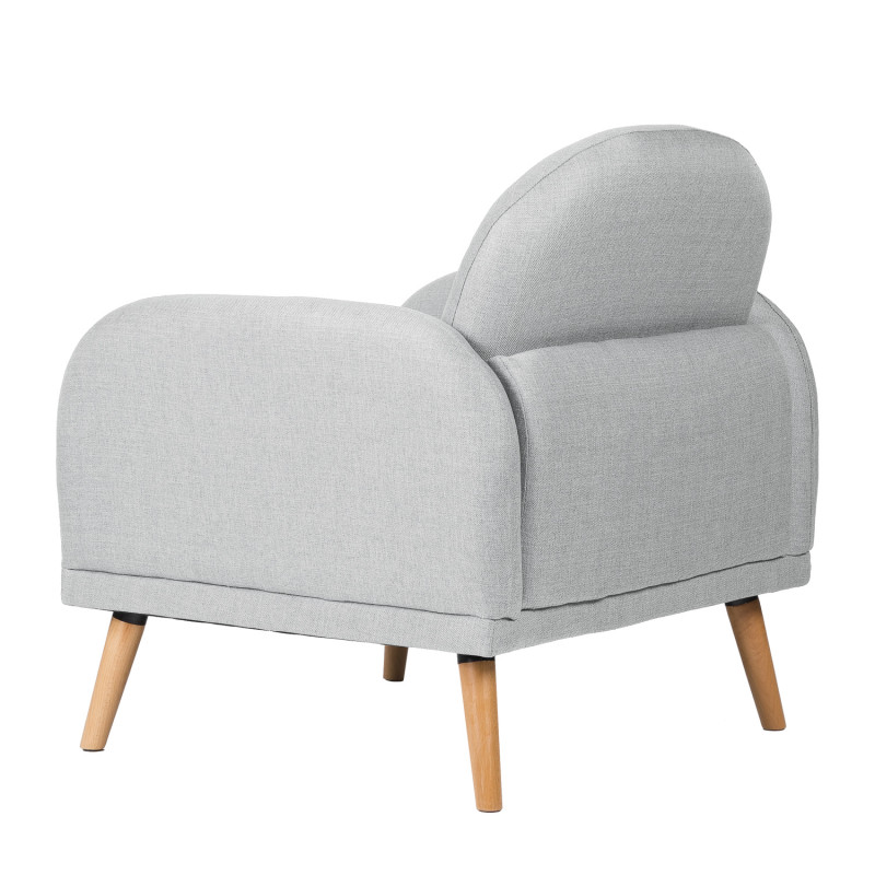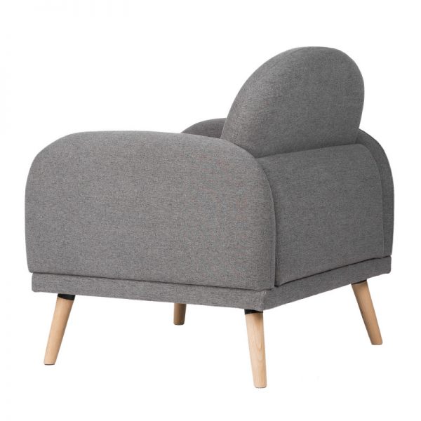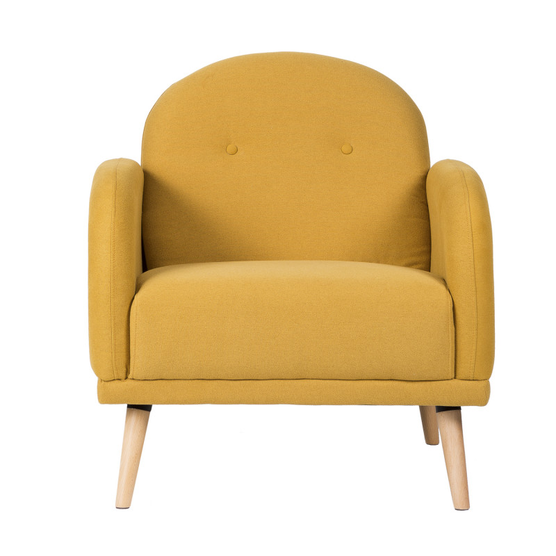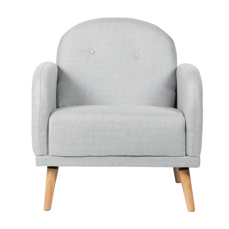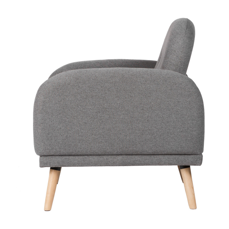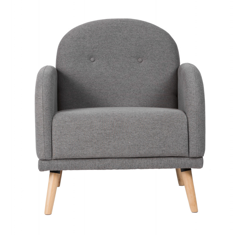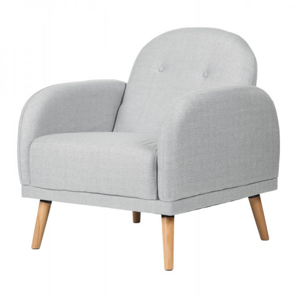 Butaca tapizada con patas de madera ligeramente inclinadas acabadas en color natural.