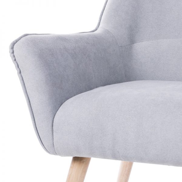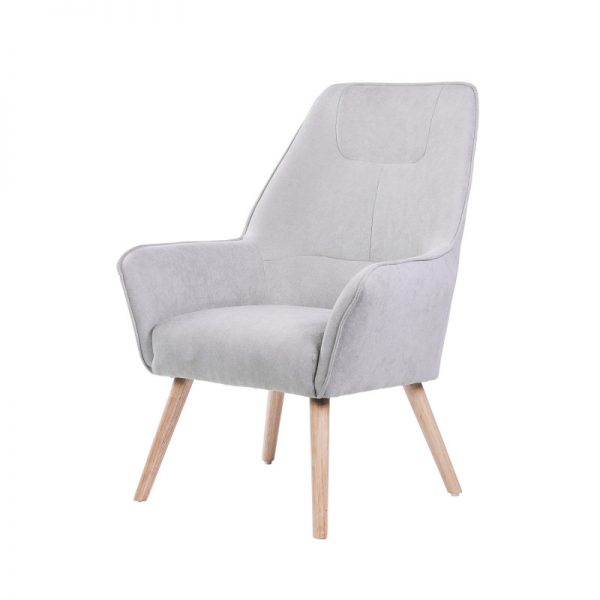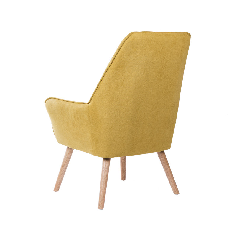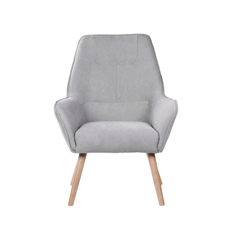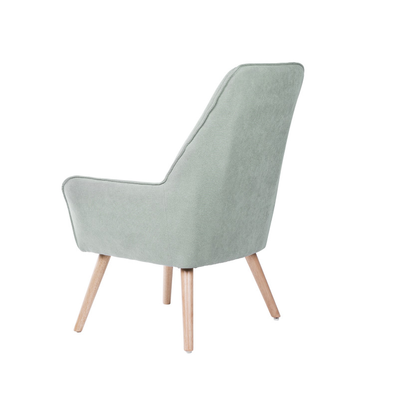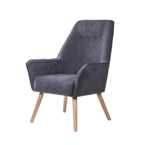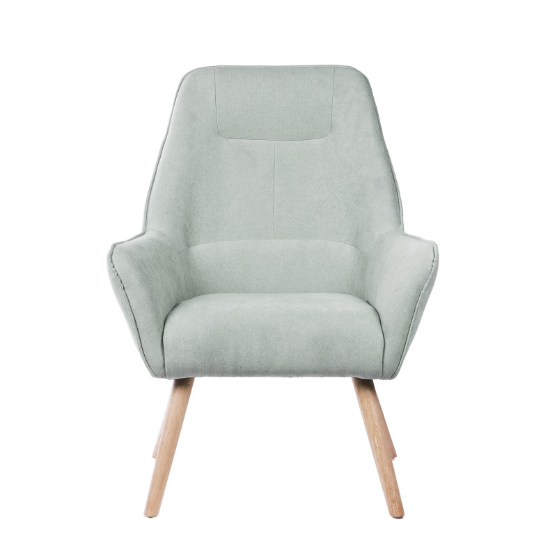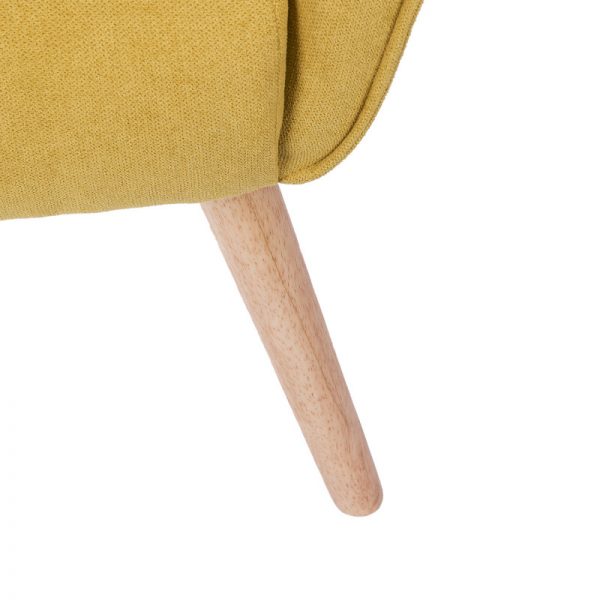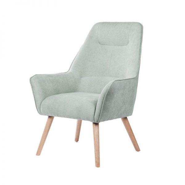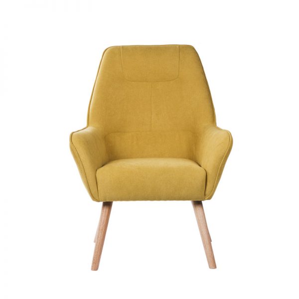 Butaca tapizada con patas ligeramente inclinadas en madera acabado natural.
