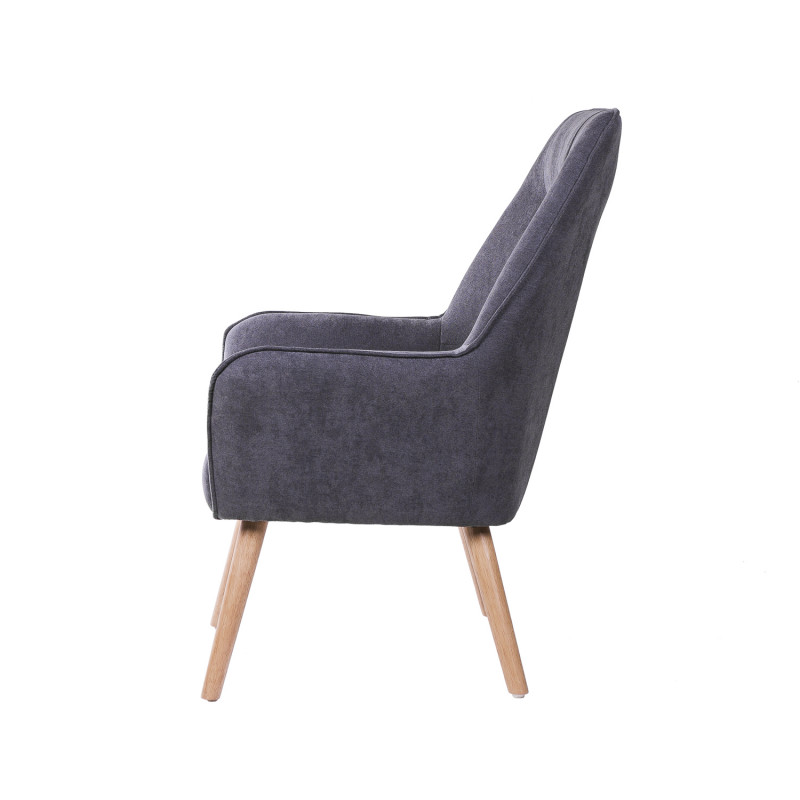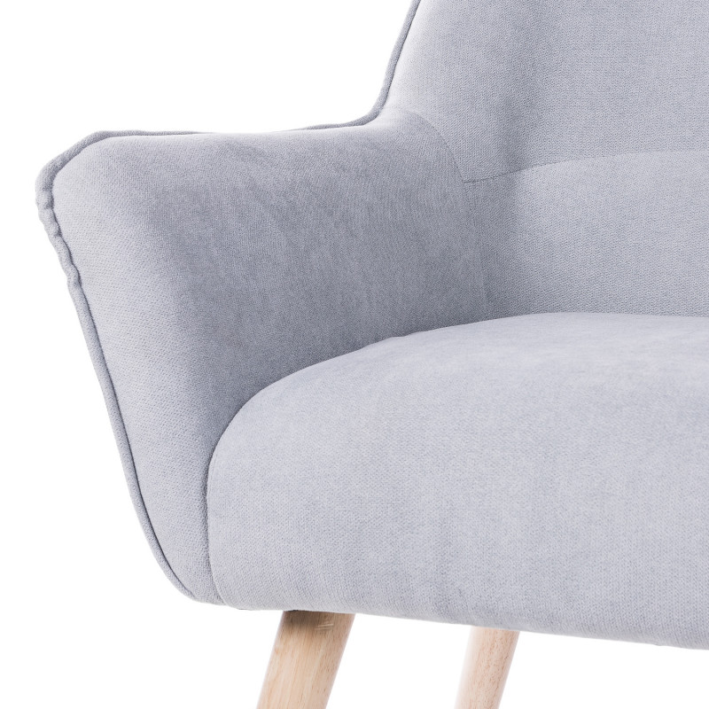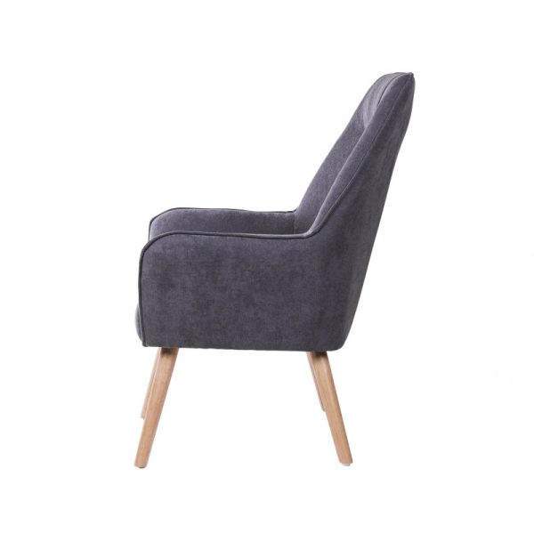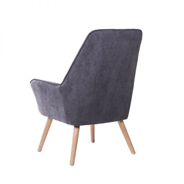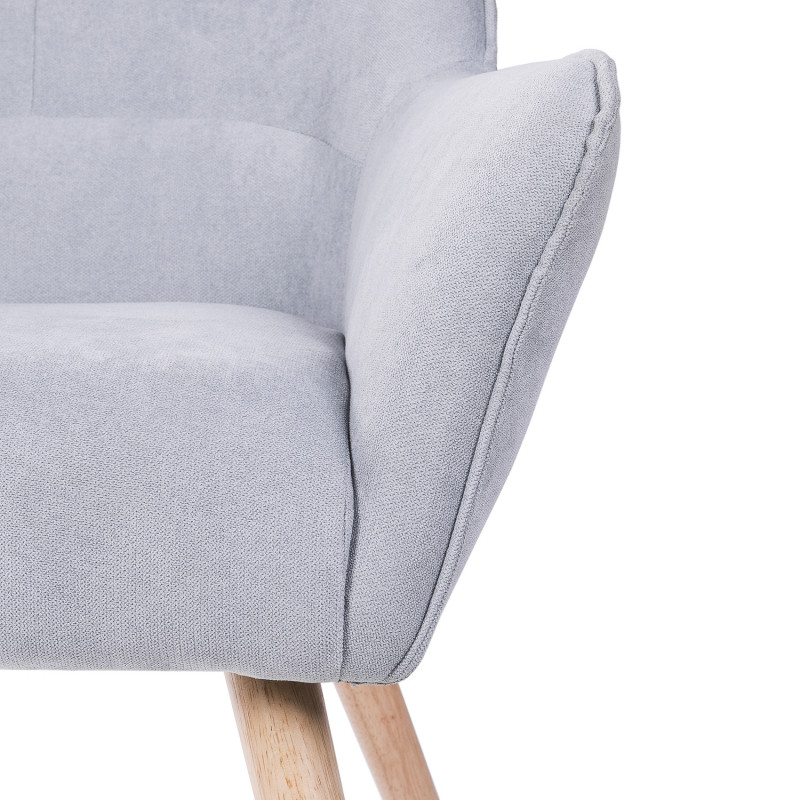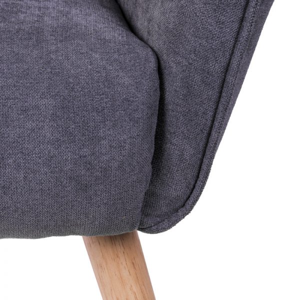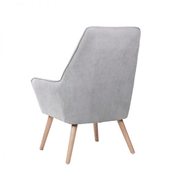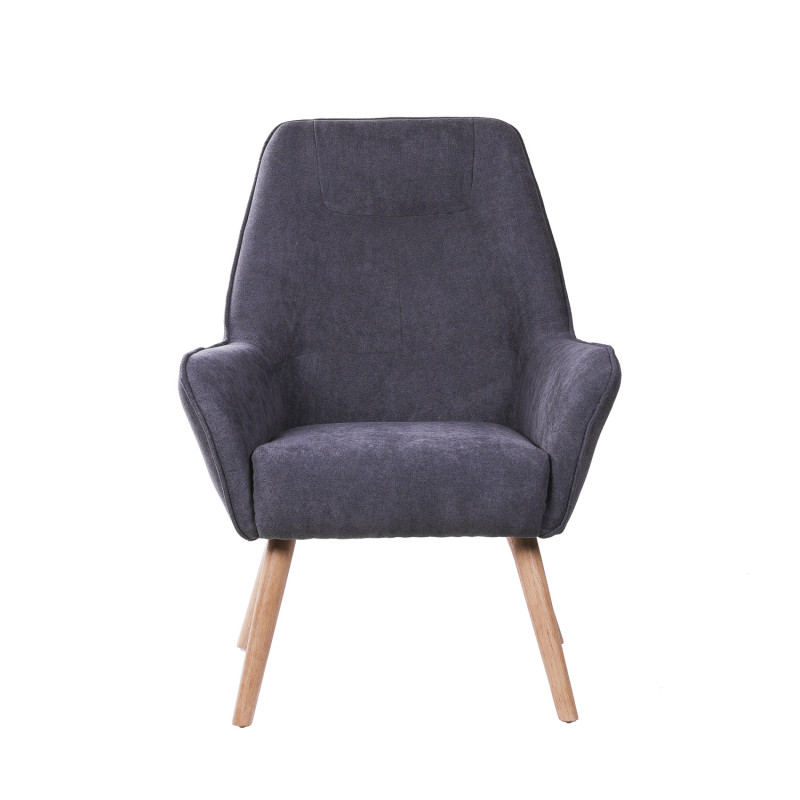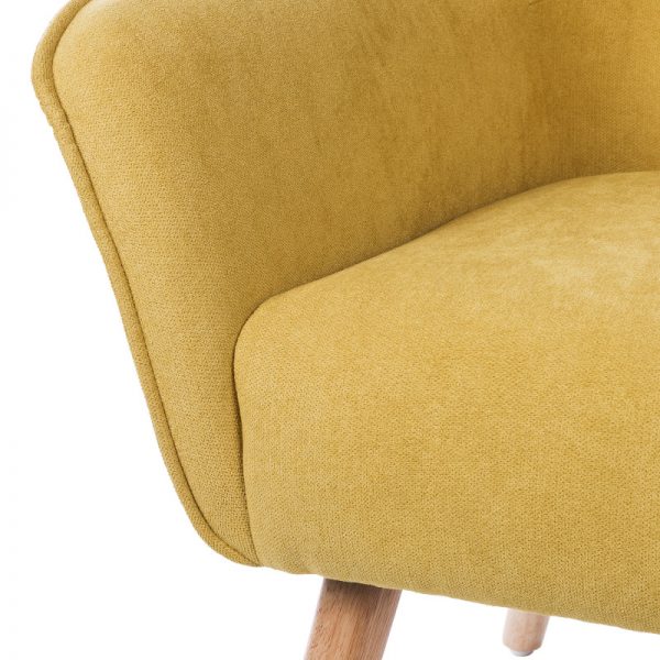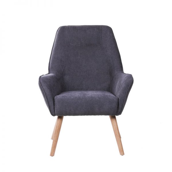 Butaca tapizada con patas ligeramente inclinadas en madera acabado natural.