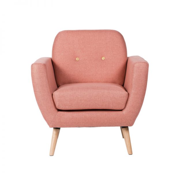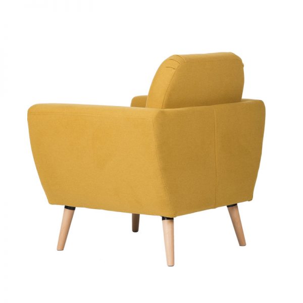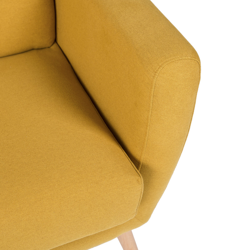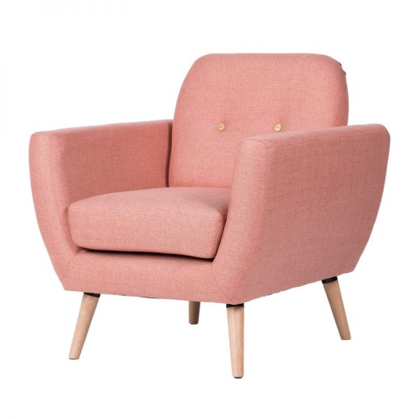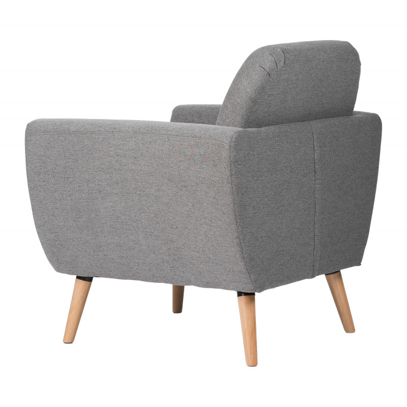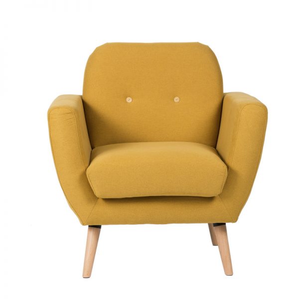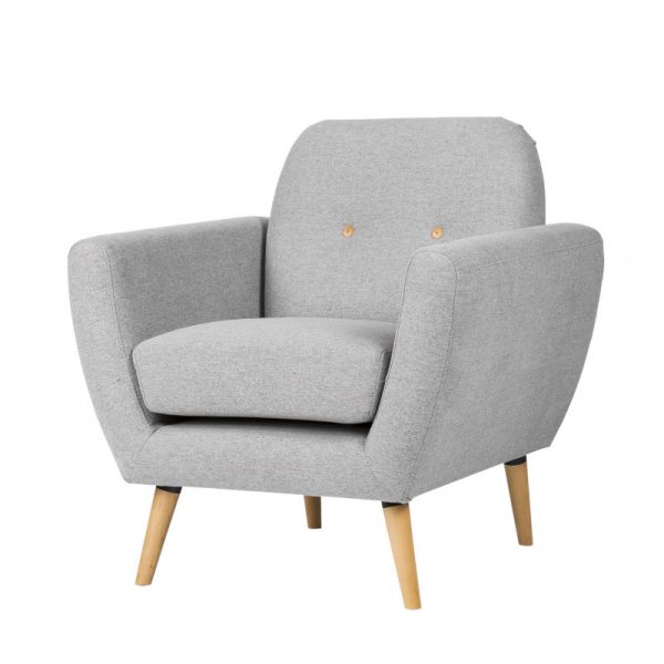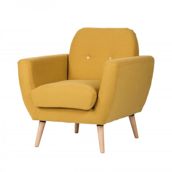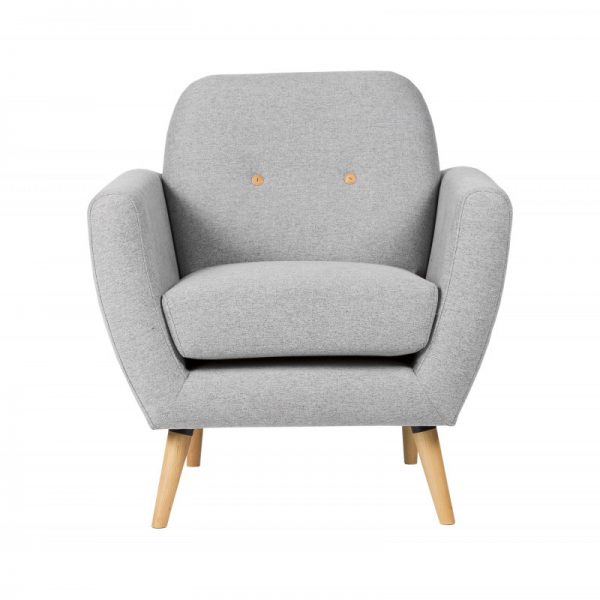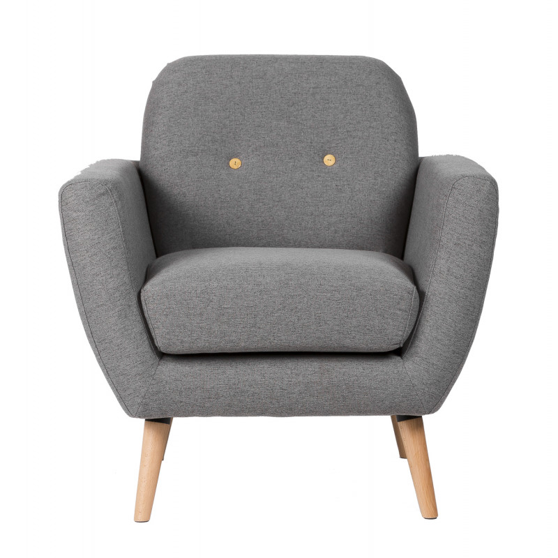 Butaca tapizada con patas de madera ligeramente inclinadas acabadas en color natural.