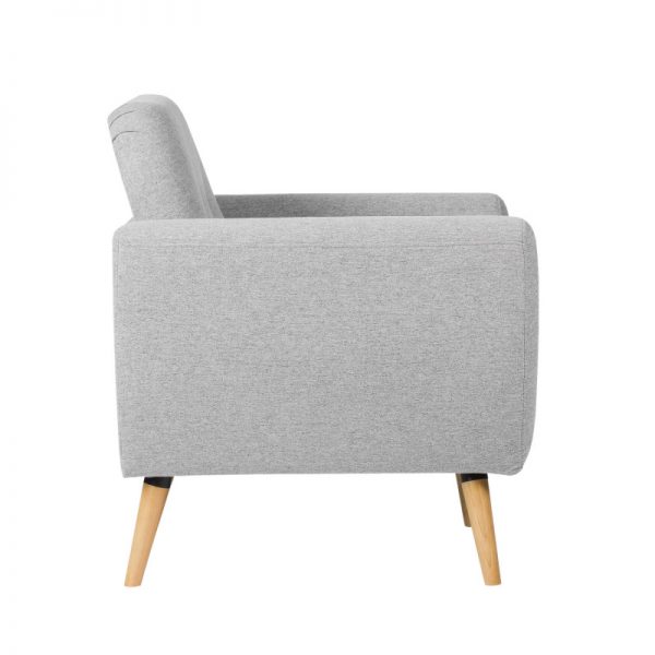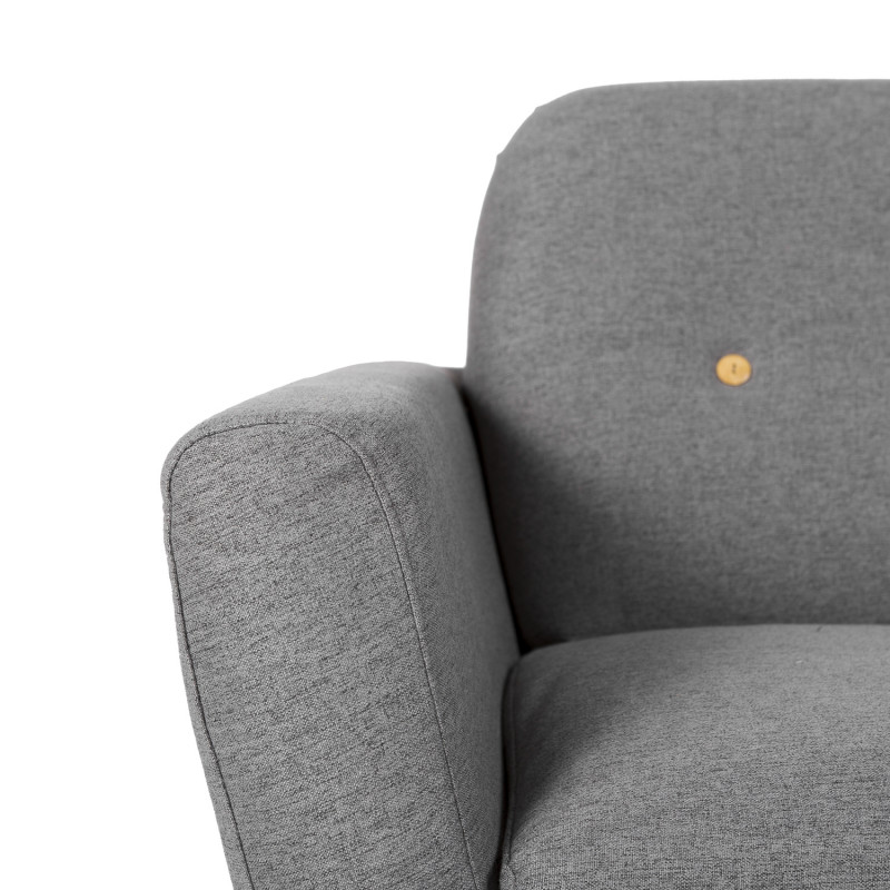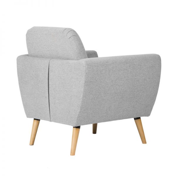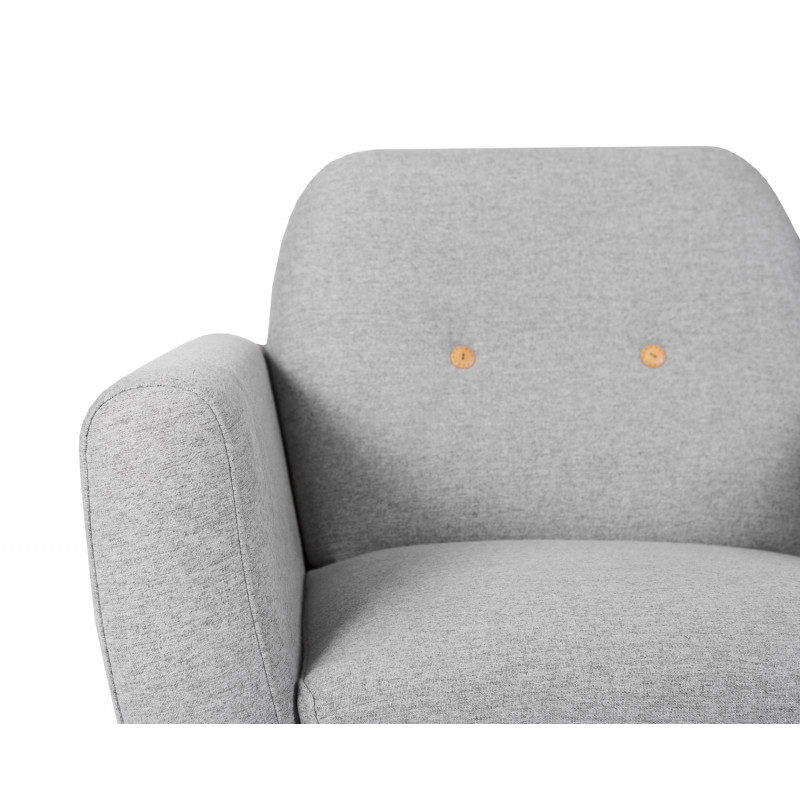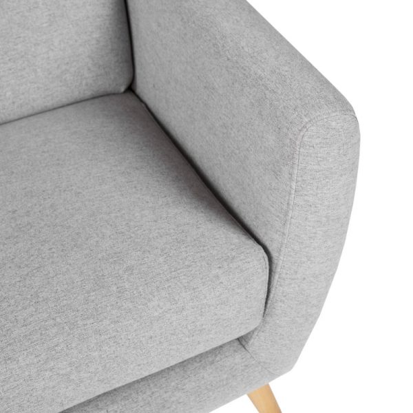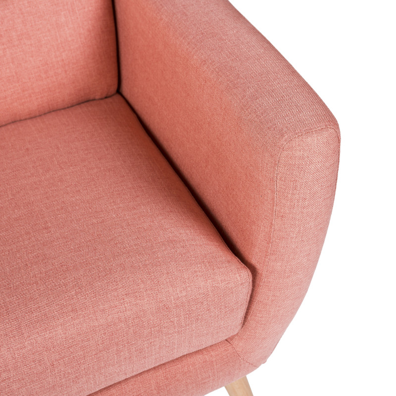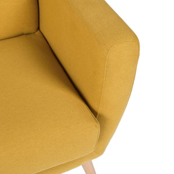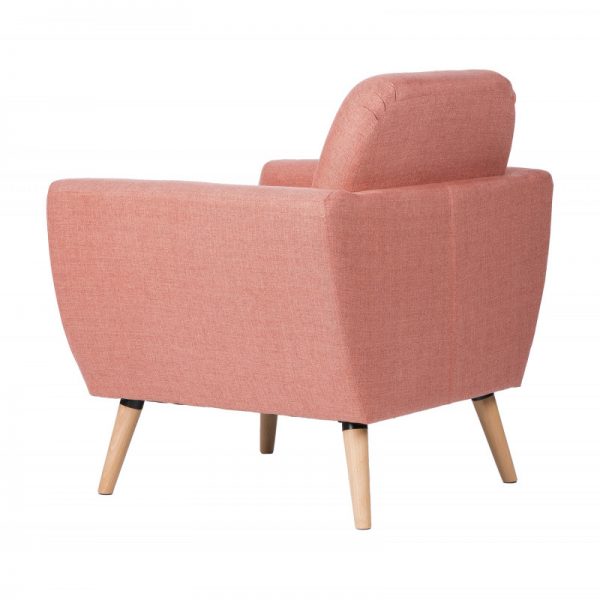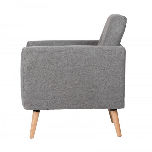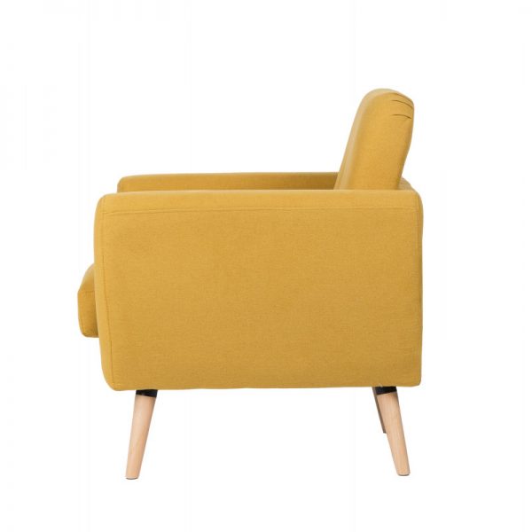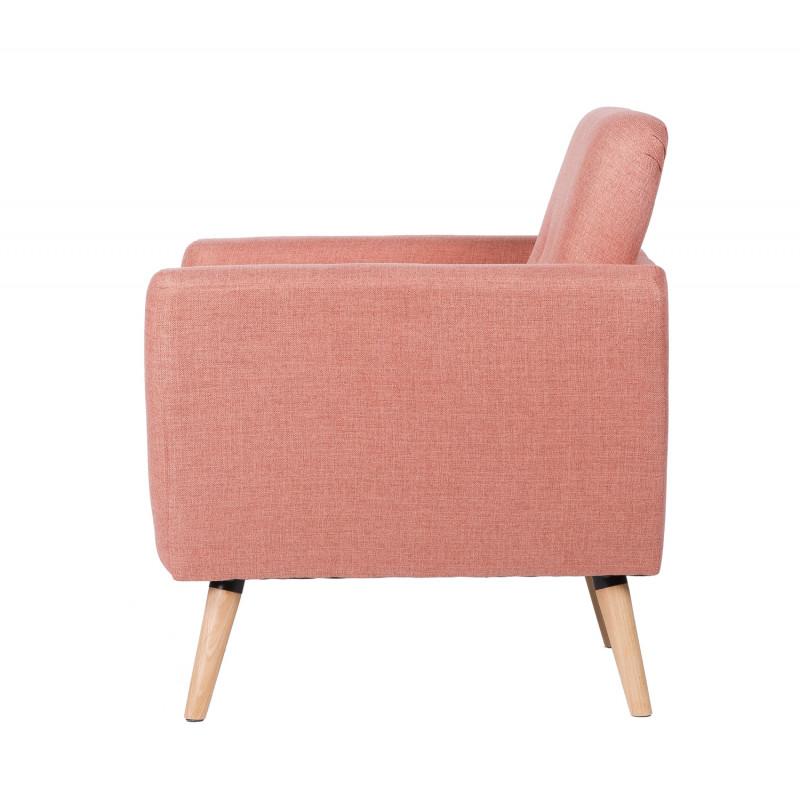 Butaca tapizada con patas de madera ligeramente inclinadas acabadas en color natural.