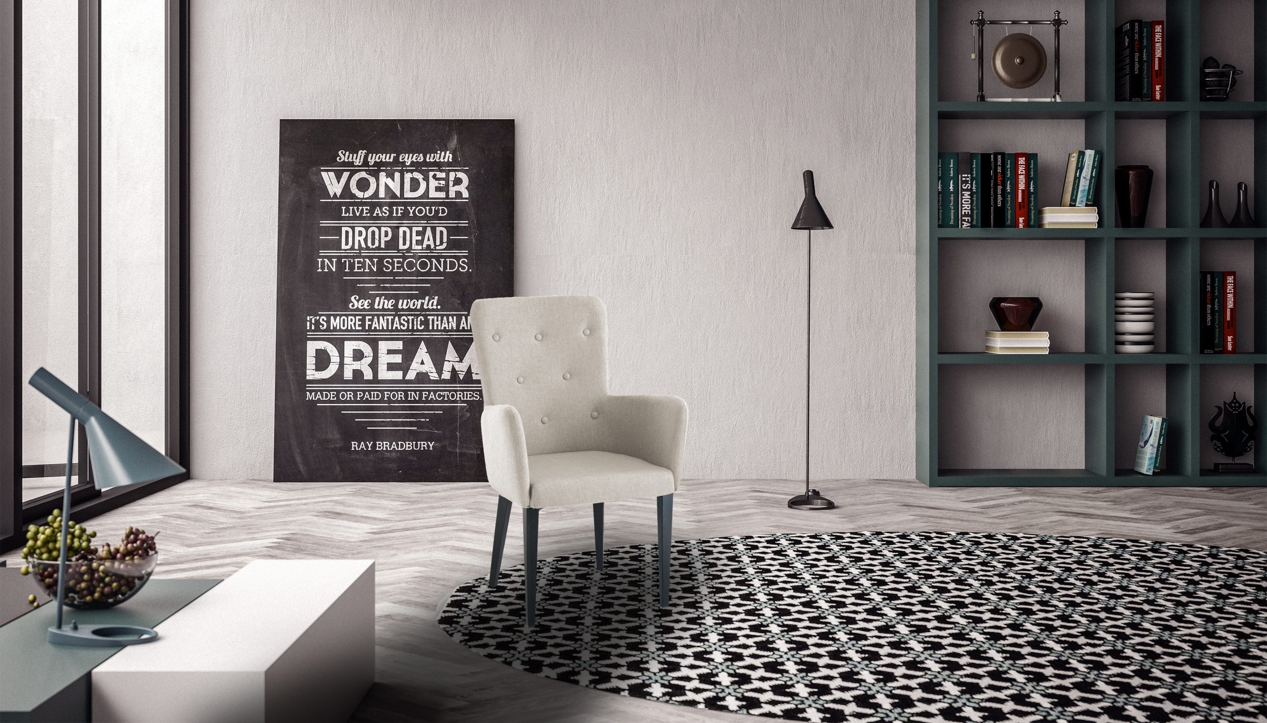 Sillón tapizado en color BEIGE con botones en el respaldo. Patas metálicas