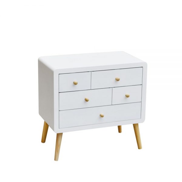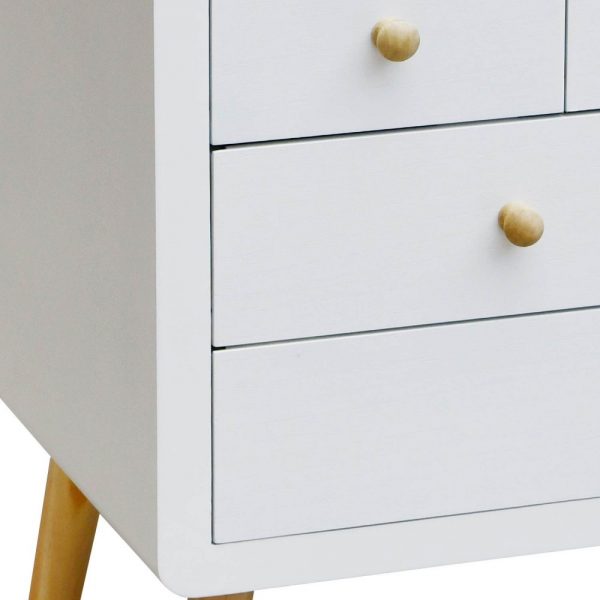 Cómoda fabricada en MDF color blanco y patas de pino en color natural.