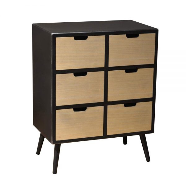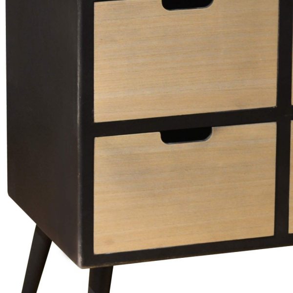 Mueble fabricado en MDF con patas de pino en color negro y cajones con chapa de madera en color natural.