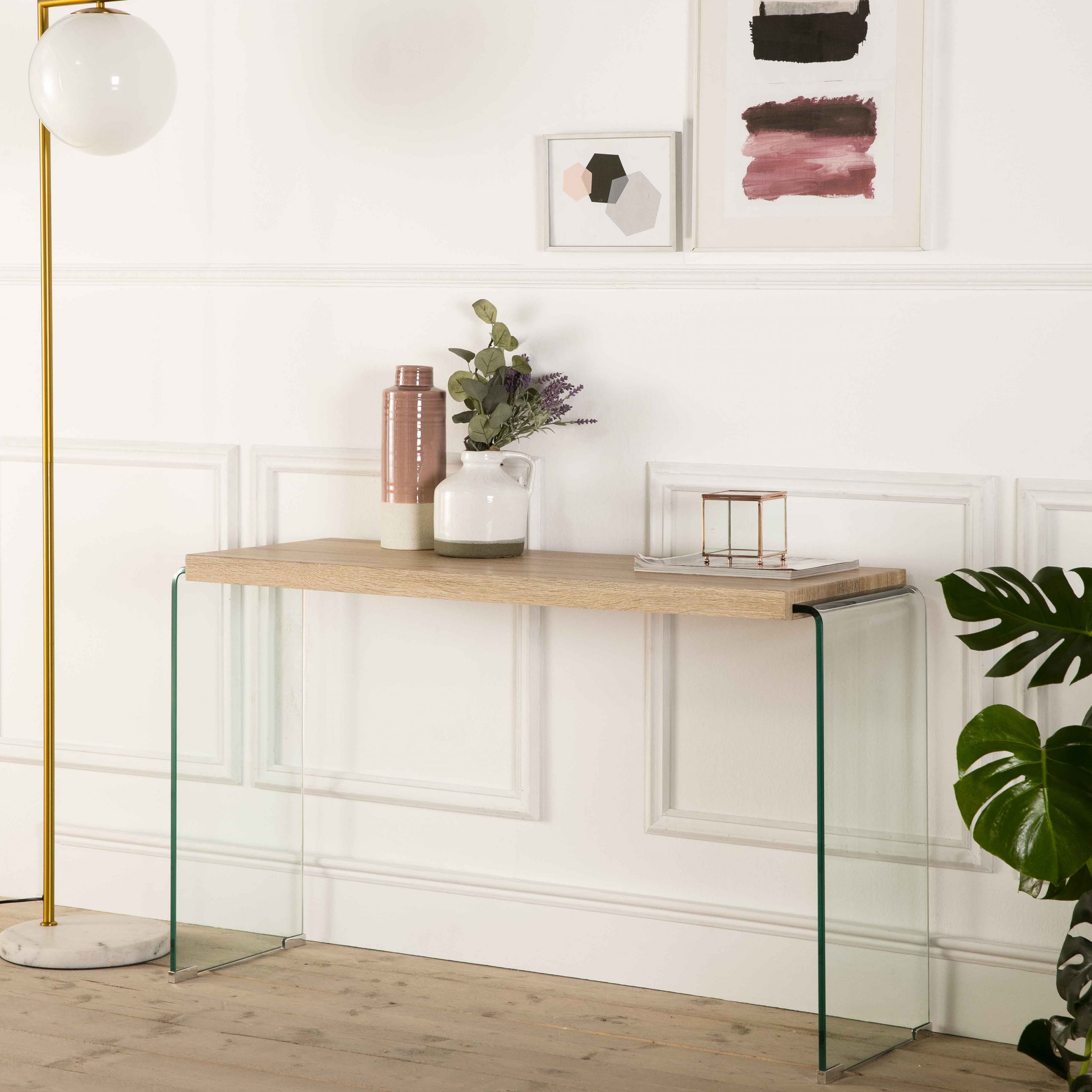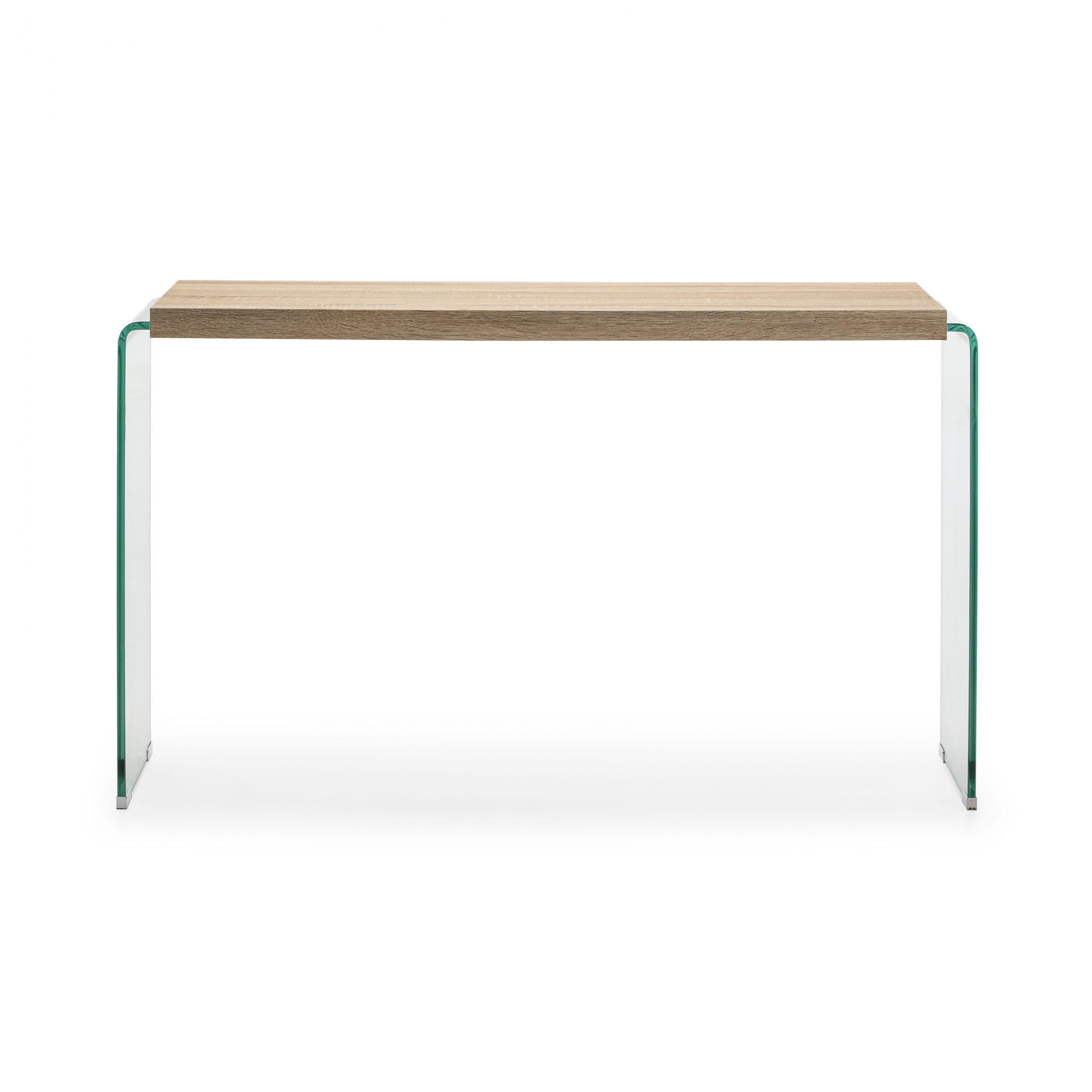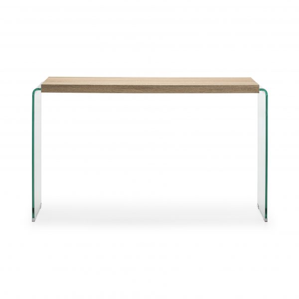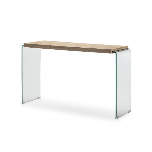 Consola de cristal con estante de madera.
