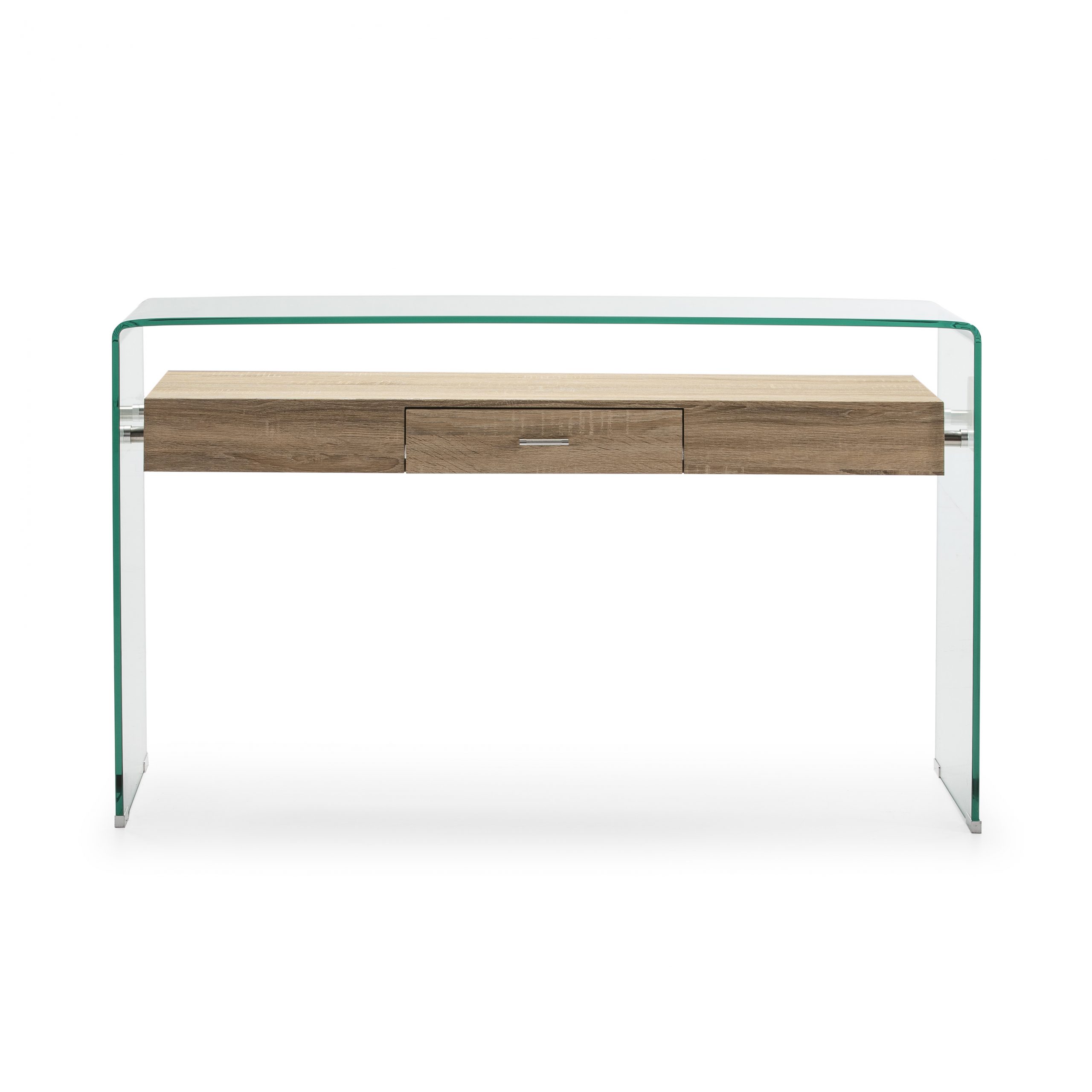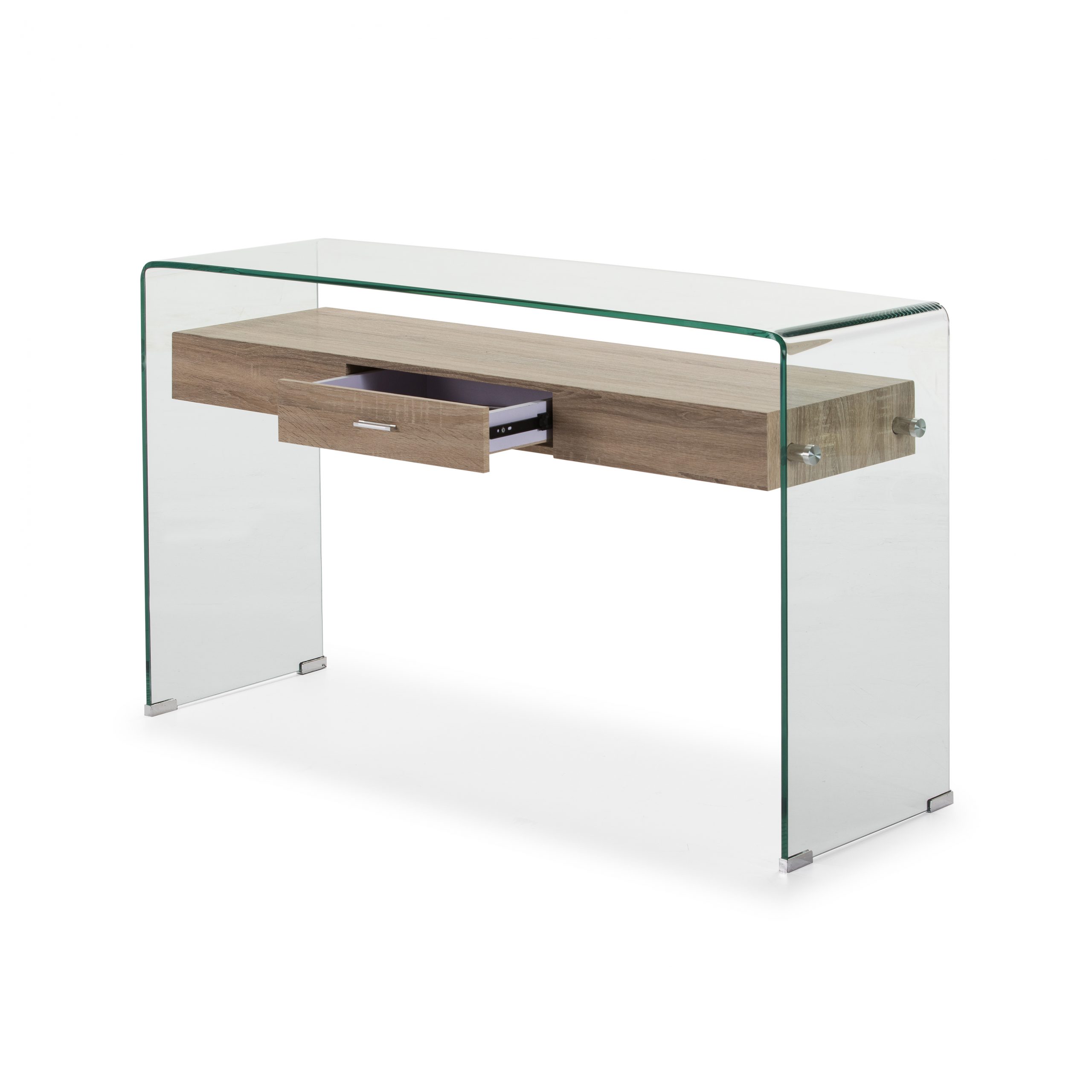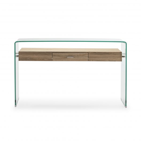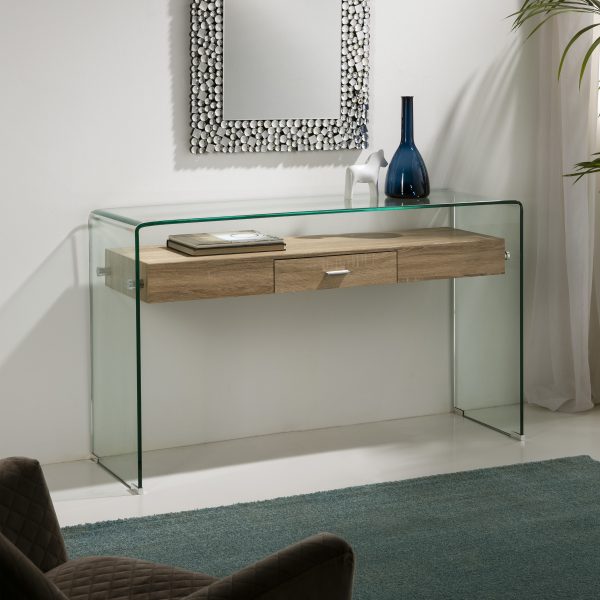 Consola de cristal con estante de madera.
