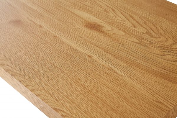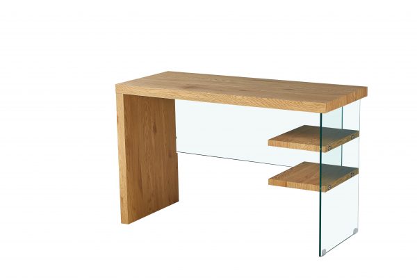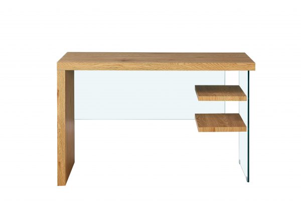 Escritorio que combina sobre y baldas de MDF vinilados color ROBLE, con cristal templado transparente.
