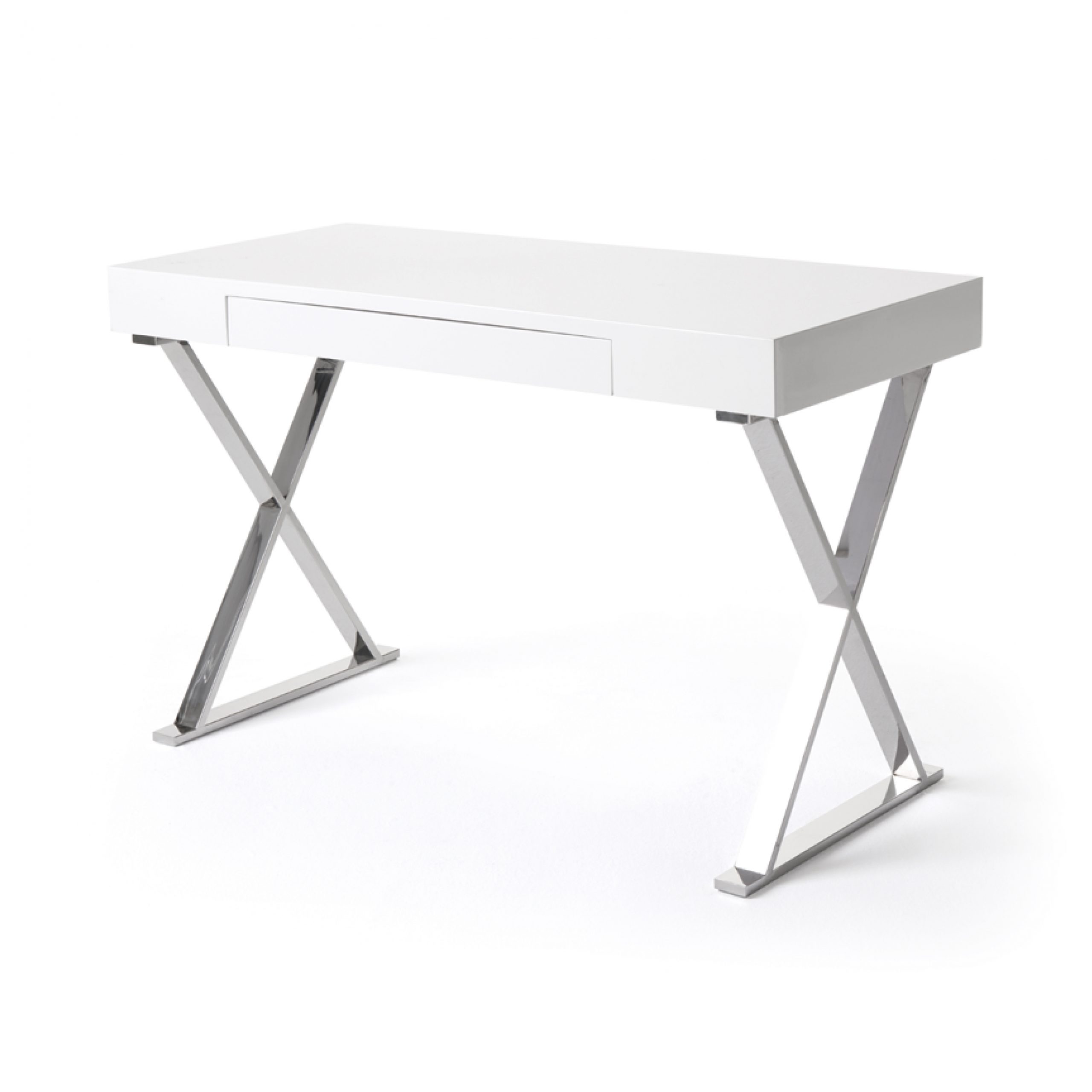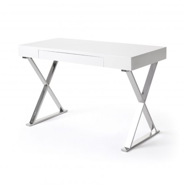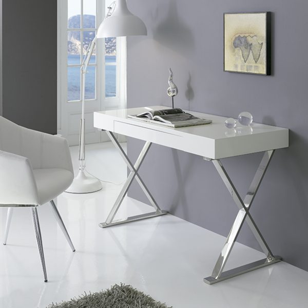 Escritorio de madera lacado en blanco con cajon. Patas de acero inoxidable.