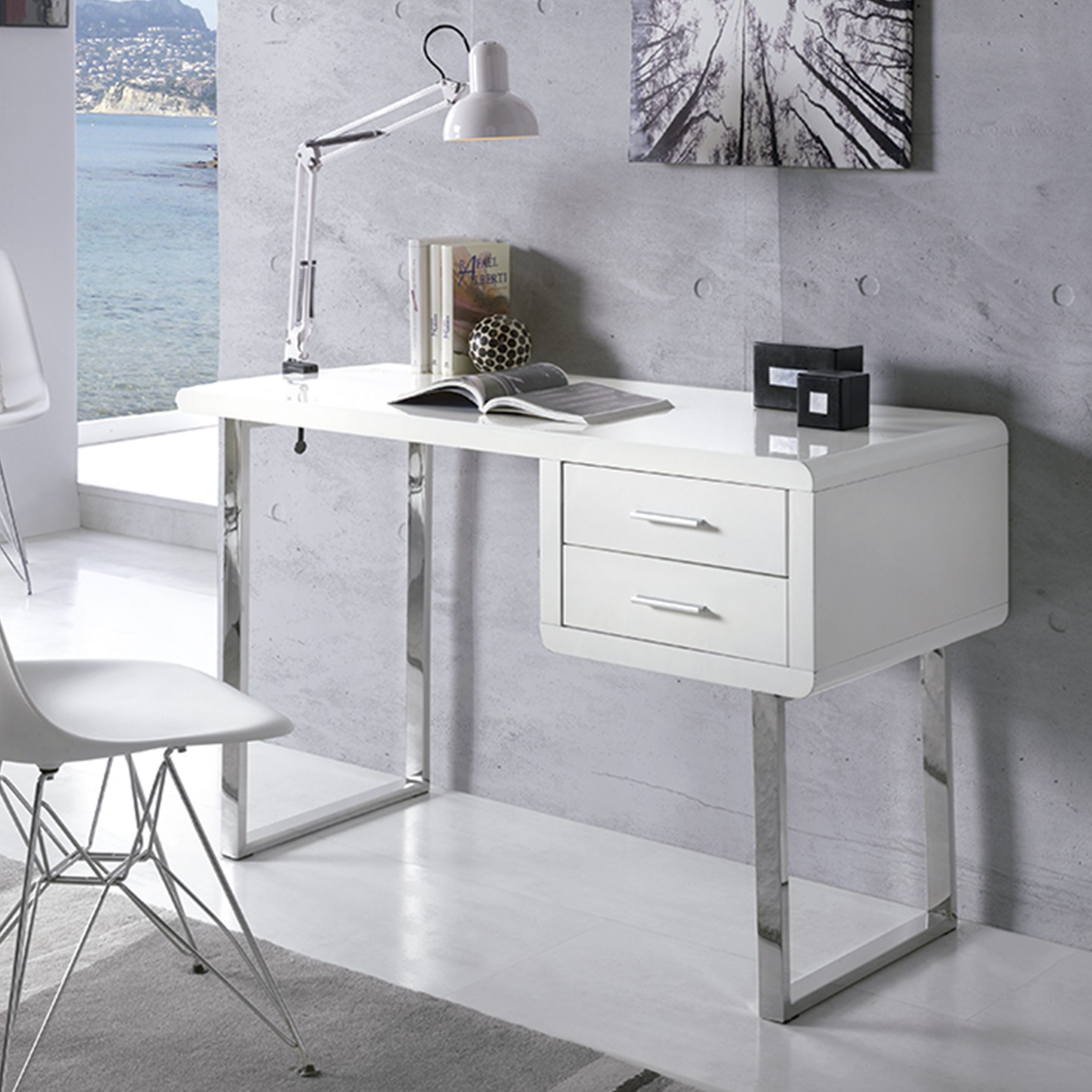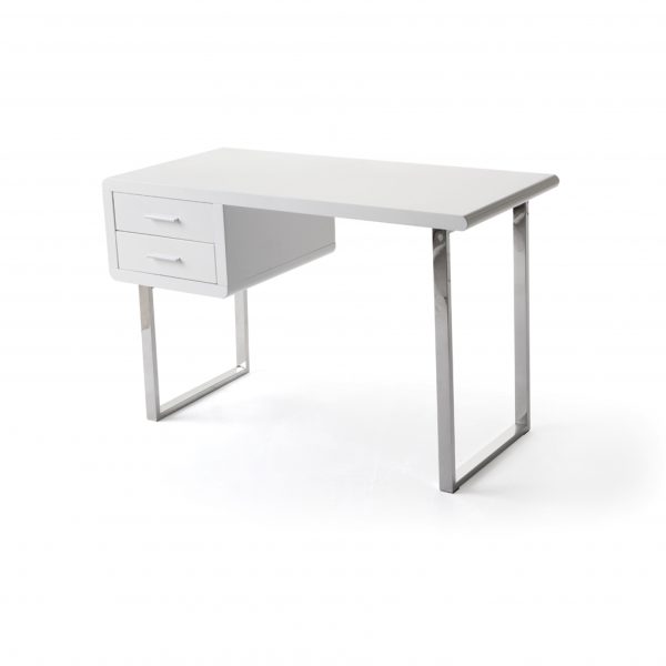 Escritorio de madera lacada blanco con cajones. Pata de acero inoxidable.