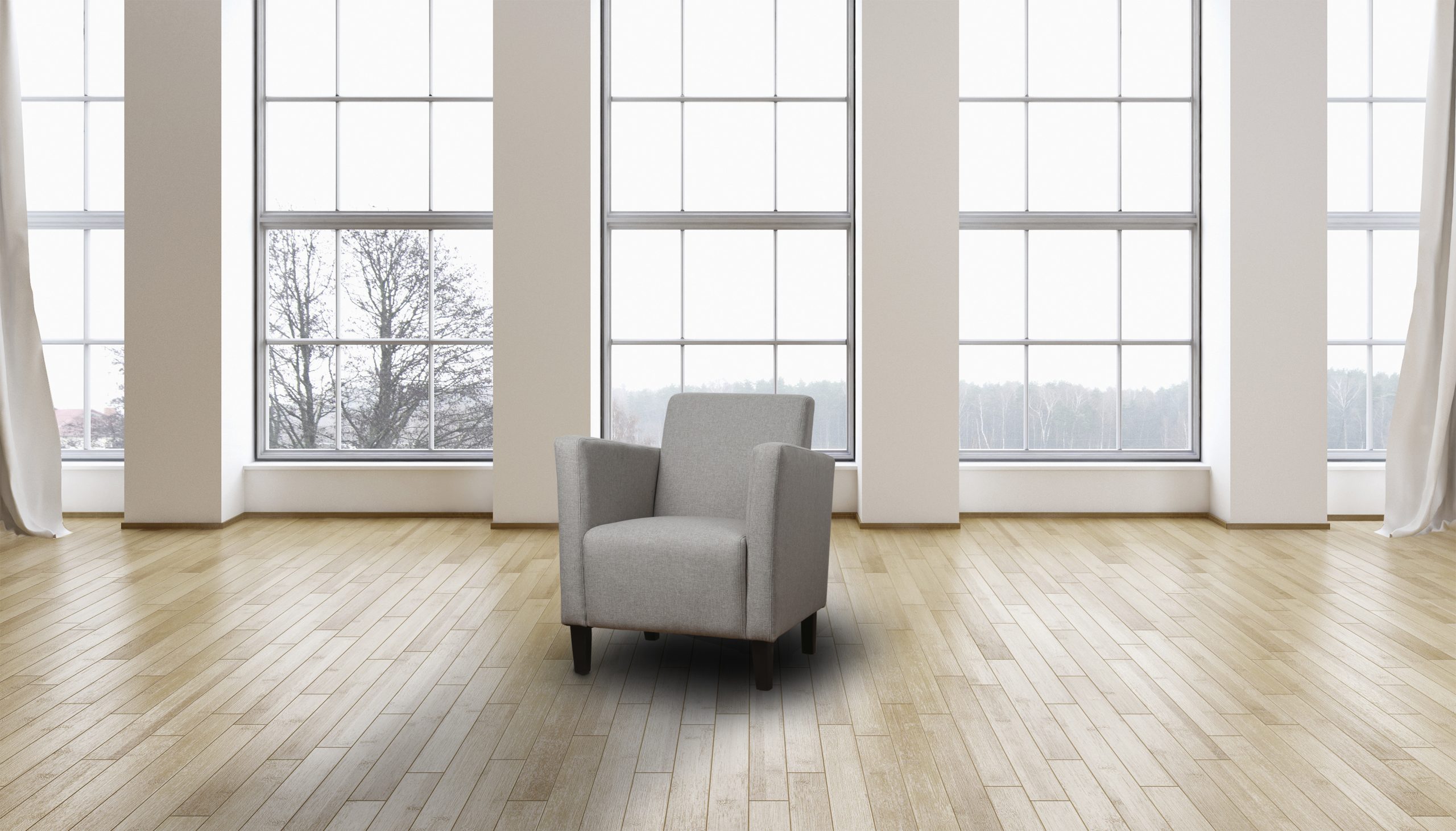 Sillón tapizado en tela gris y patas de madera maciza.Altura del asiento: 46cm.