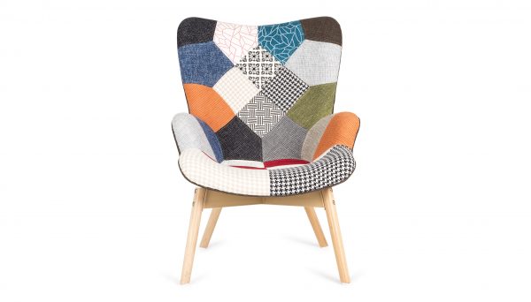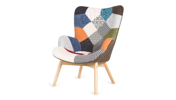 Sillón tapizado en PATCHWORK con patas de madera maciza de HAYA