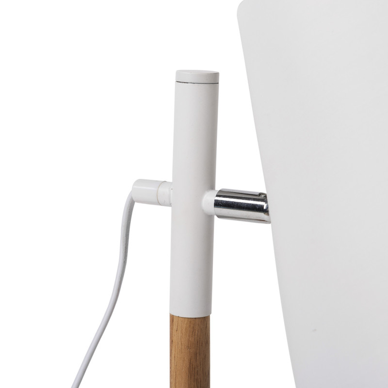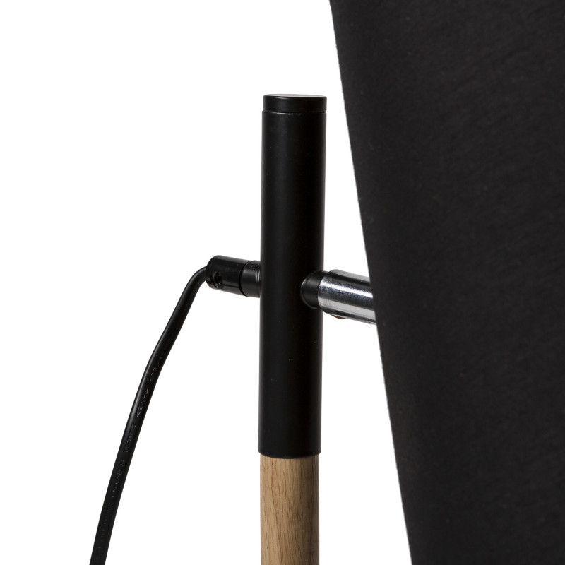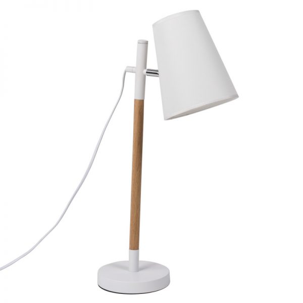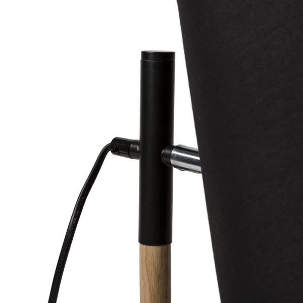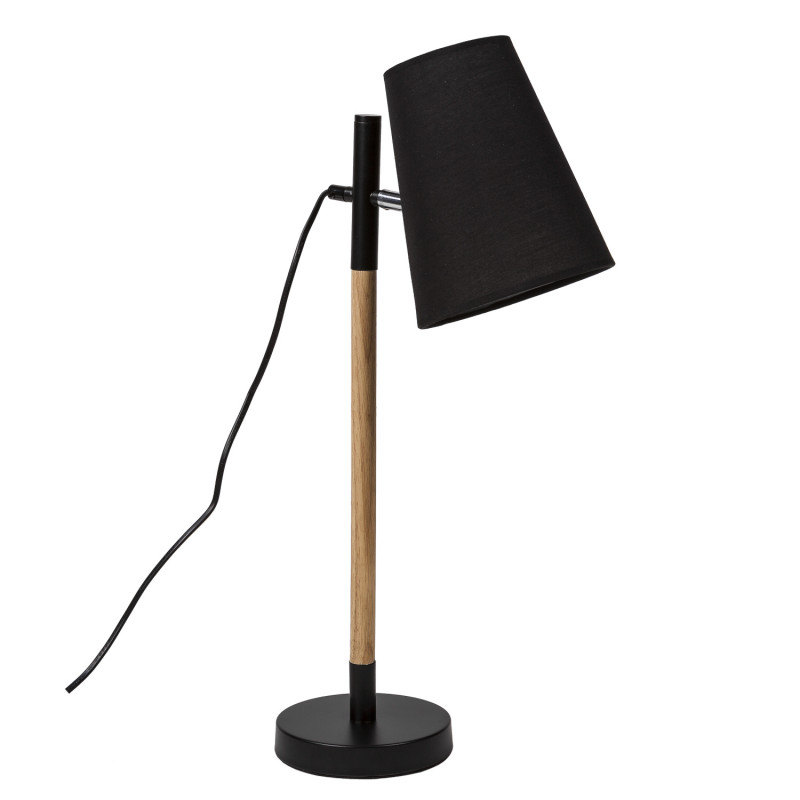Lámpara de sobremesa de diseño moderno con estructura fabricada con metal y madera acabada en color natural.