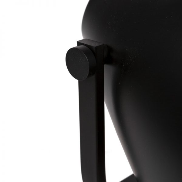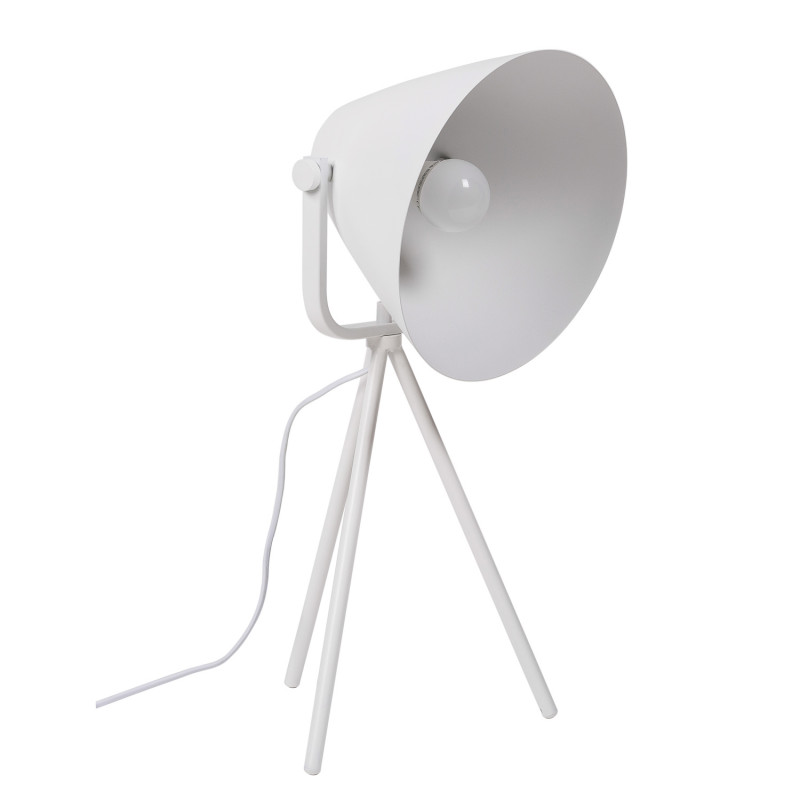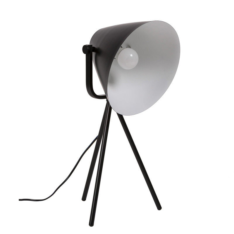 Lámpara de sobremesa con foco de forma cónica sobre trípode fabricada en metal.