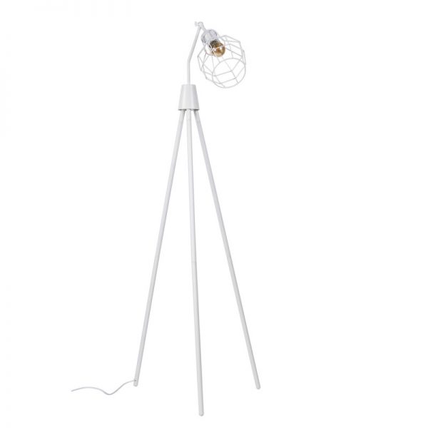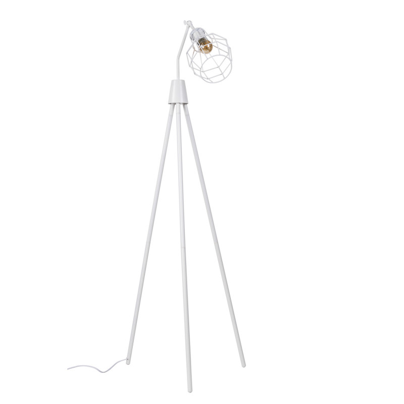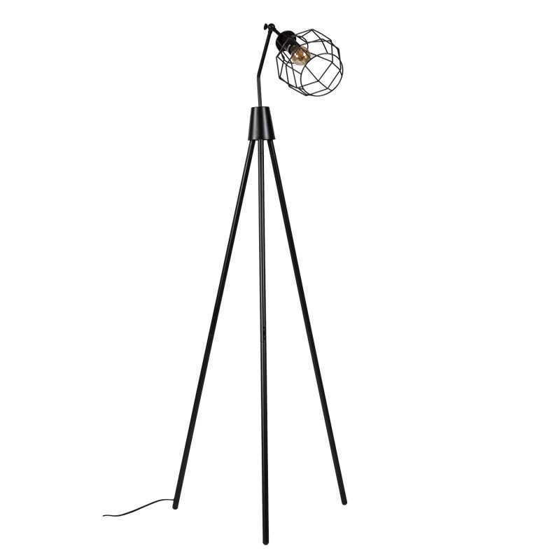 Lámpara de suelo de diseño original con pantalla fabricada con varilla sobre trípode de metal.