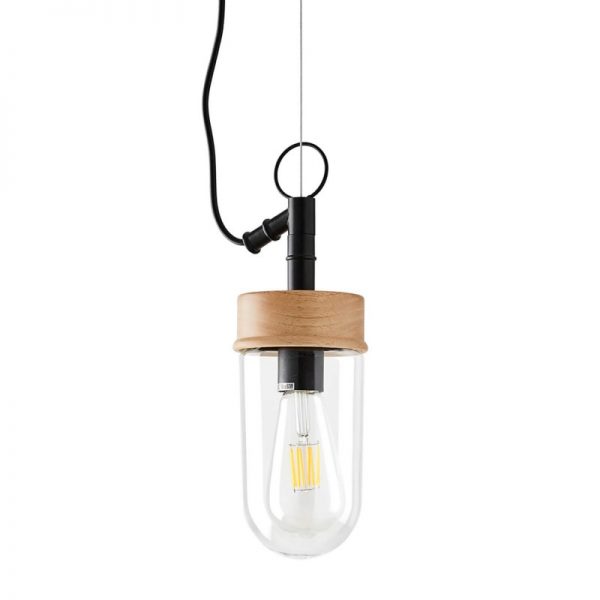 Lámpara de techo de diseño nórdico que combina el cristal con la madera y el metal negro. La combinación de materiales y su diseño la hacen perfecta para ambientes nórdicos.