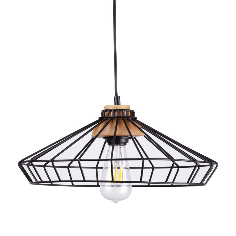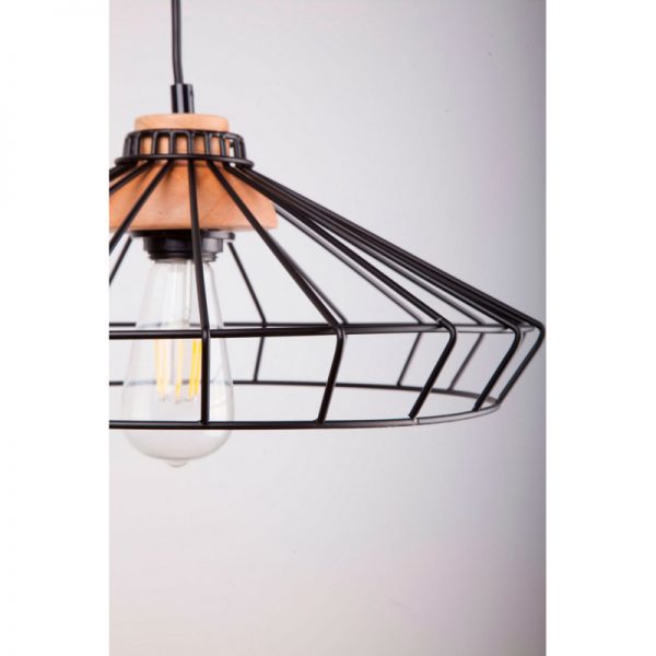 Lámpara de techo forma circular fabricada con varilla metálica negra y madera natural.
