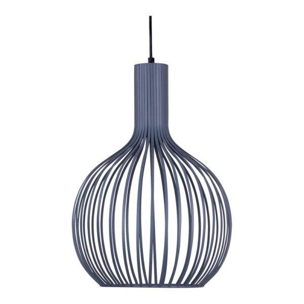 Lámpara de techo metálica en finas tiras de metal gris en mate y con forma curva pera. Líneas sencillas que combinan con cualquier tipo de ambiente.
