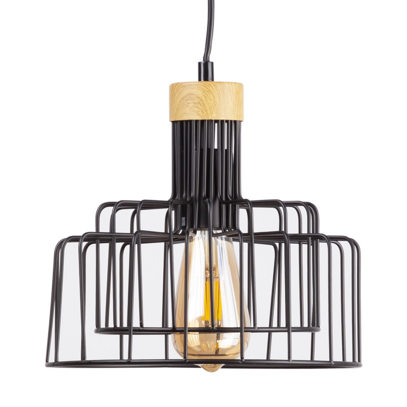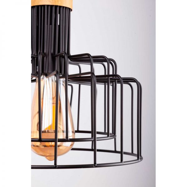 Lámpara de techo de forma circular con dos líneas de varilla metálica negra y remate en madera natural.