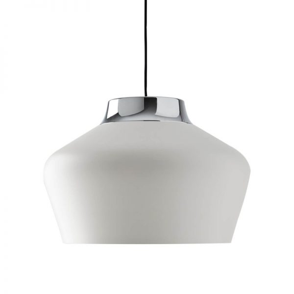 Elegante lámpara de techo de forma circular en color blanco y con remate superior en cromo. Fabricada en metal lacado, elemento destacable en cualquier comedor.