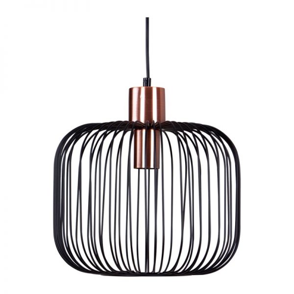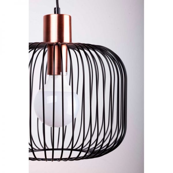 Elegante lámpara de techo fabrica en fino metal en color negro y rematada en un elegante soporte de metal cobrizo dorado.