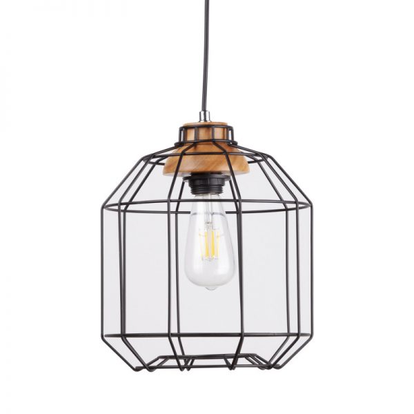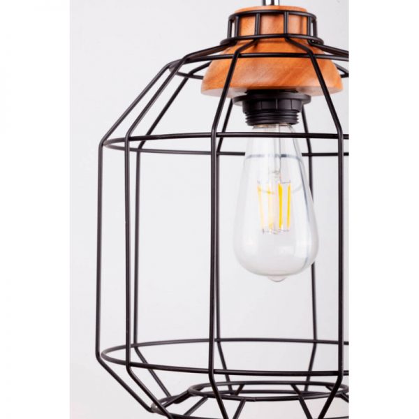 Lámpara de techo de forma hexagonal fabricada con varilla metálica negra y combinada con madera.