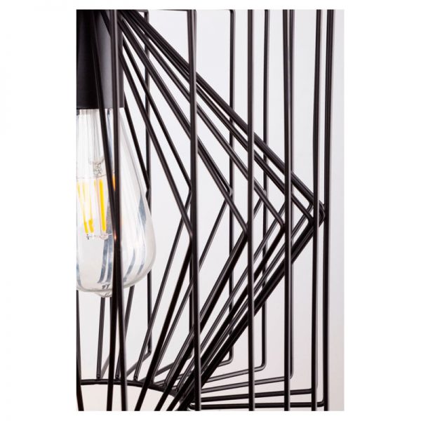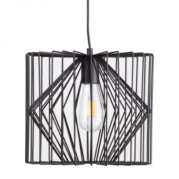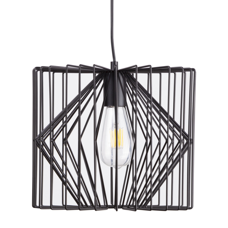 Lámpara de techo metálica de forma circular y diseño interior romboide, en varilla metálica negra.