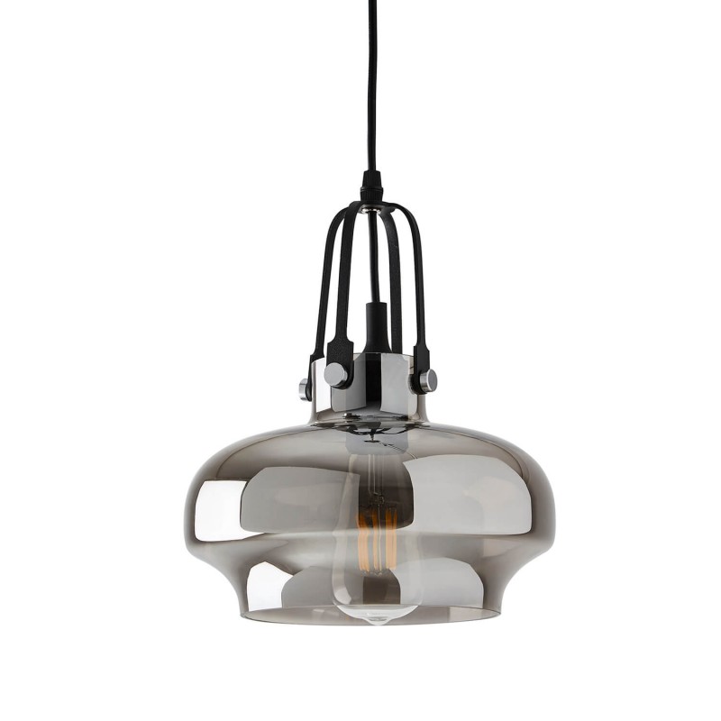 Lámpara de techo de diseño moderno y líneas curvas fabricada en cristal efecto smoke brillante. Original remate superior en metal, para dar un toque moderno y elegante al salón.