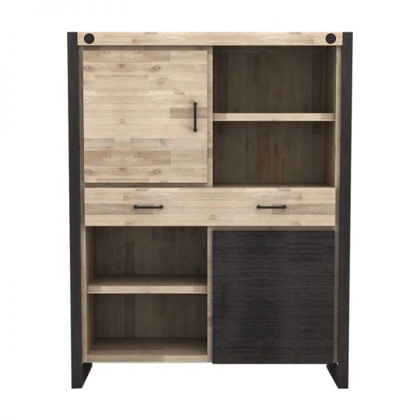 Un mueble con una gran utilidad ya que dispone de cajón central (con guías metálicas) y dos puertas, una de madera y la otra con chapa de metal, además de estantes para almacenar.