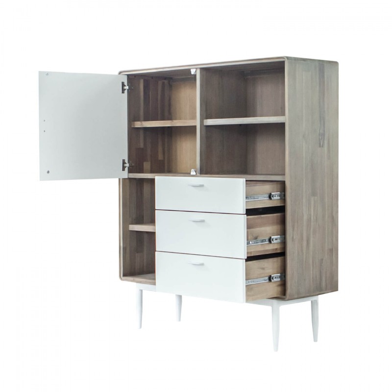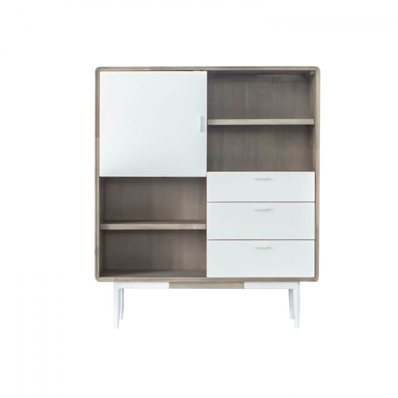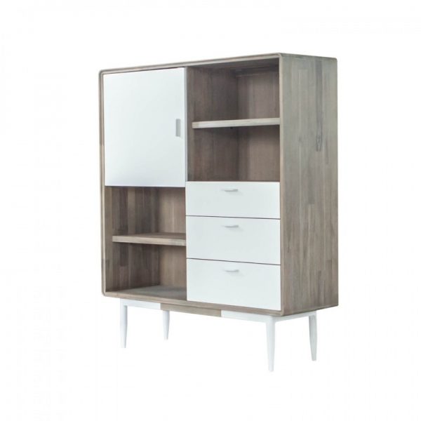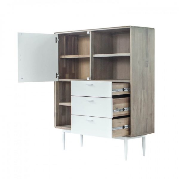 Librero bajo con diseño actual y gran capacidad fabricado en madera de acacia y frentes en DM lacado blanco. Libero con puerta y 3 cajones con guías metálicas. Patas en metal blanco.