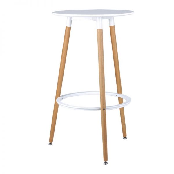 Mesa redonda alta ø 60cm. Una mesa fabricada en DM lacado blanco y patas en madera de haya con base metálica. El aro reposapíes fabricado en ABS blanco. Con reguladores de nivel en las patas.