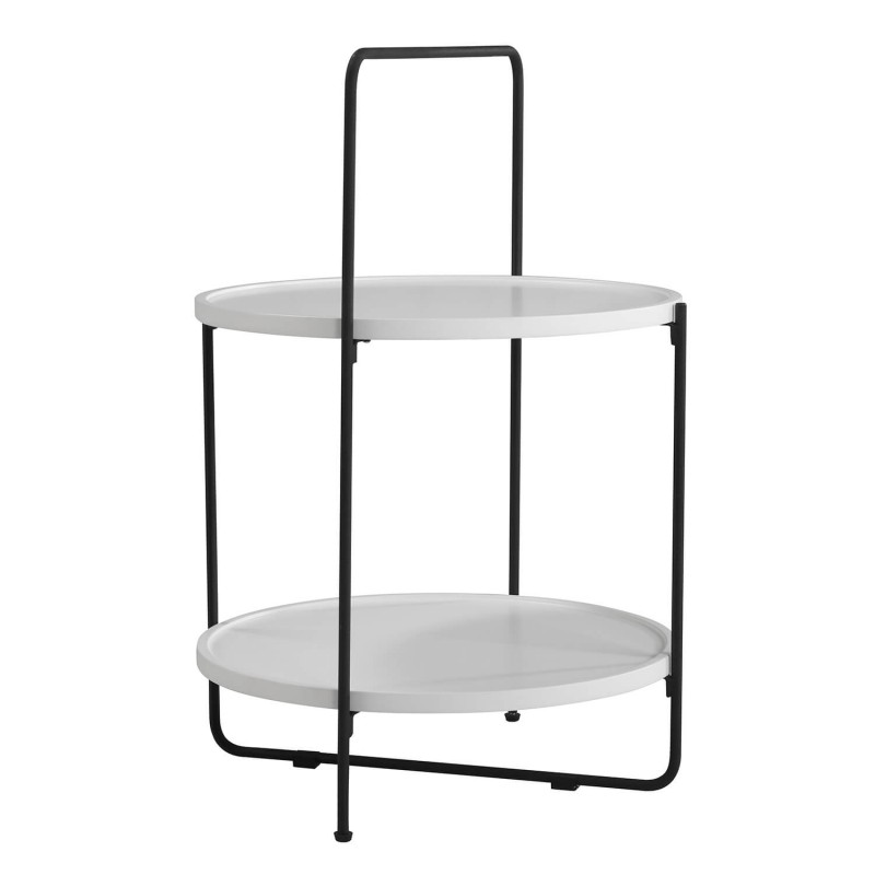 Original mesa auxiliar con bandejas, fabricada en estructura de metal mate y con dos bandejas en DM lacado blanco. La estructura de metal en forma de asa para facilitar su traslado.