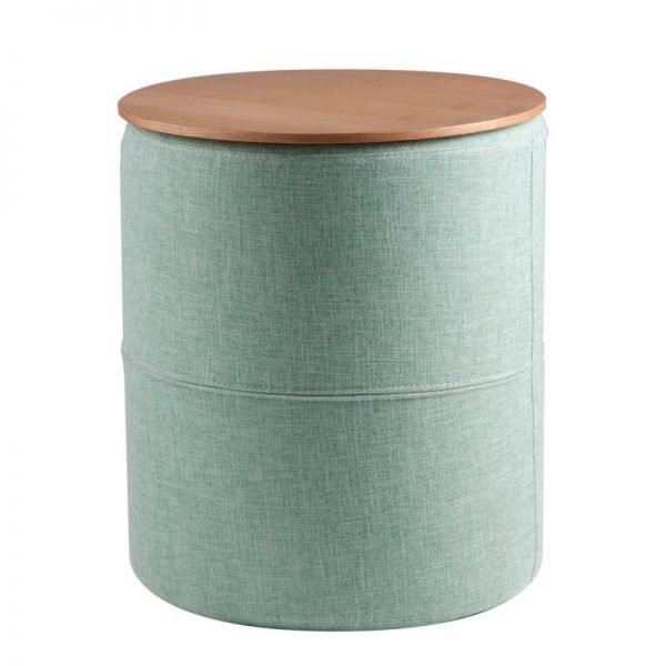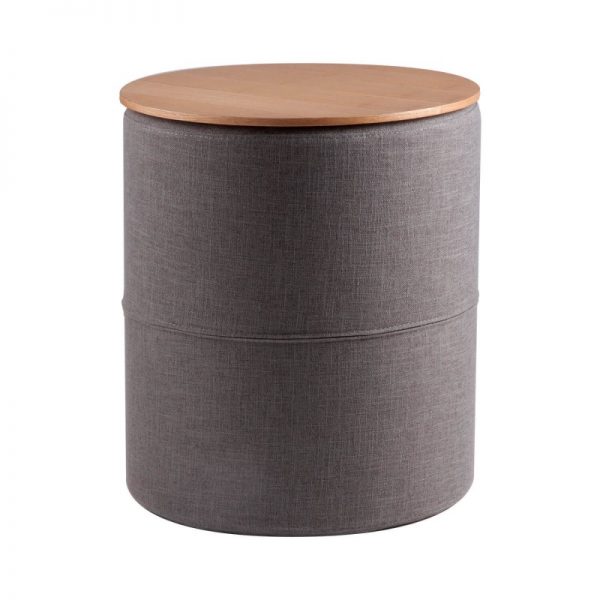 Mesa auxiliar tapizada, con relleno de espuma de alta densidad y tapa redonda en roble.