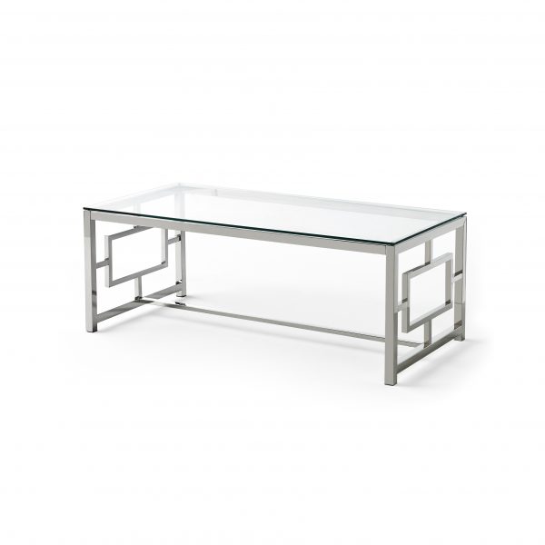 Mesa de centro de cristal templado 10mm. Estructura de acero inoxidable.