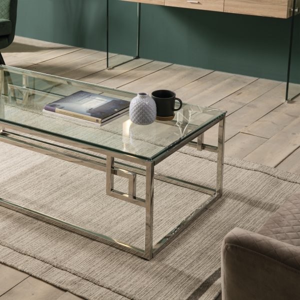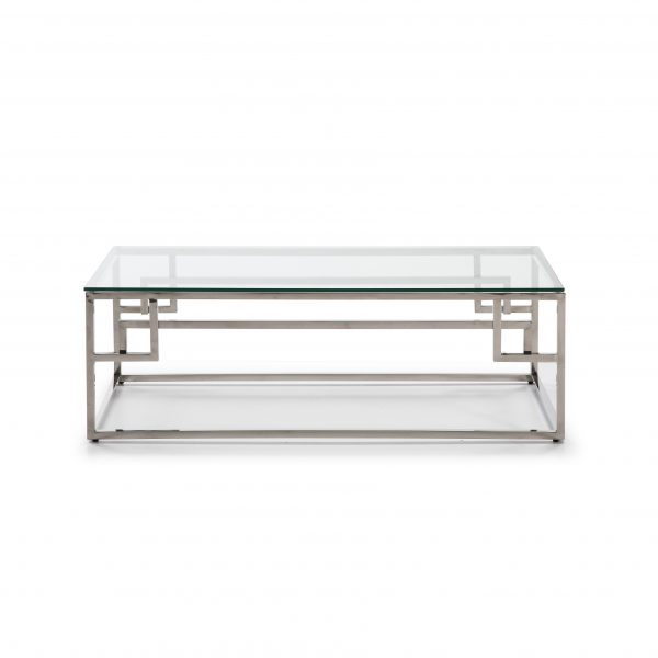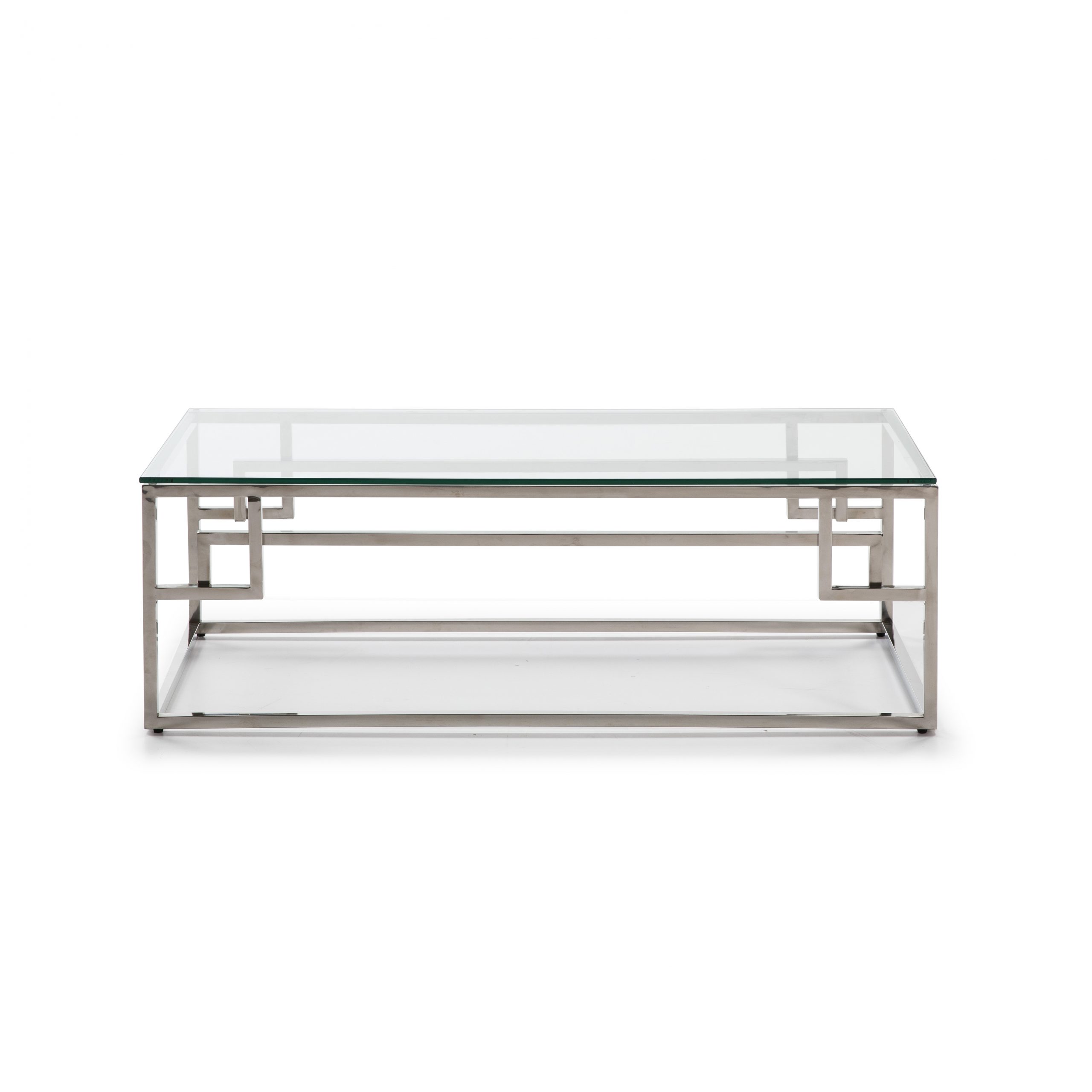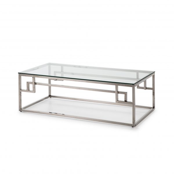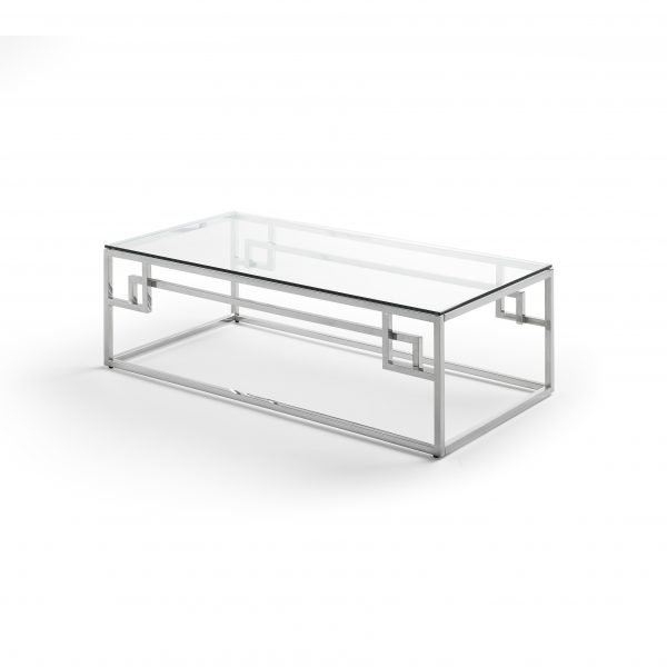 Mesa de centro de cristal templado 10mm. Estructura de acero inoxidable.