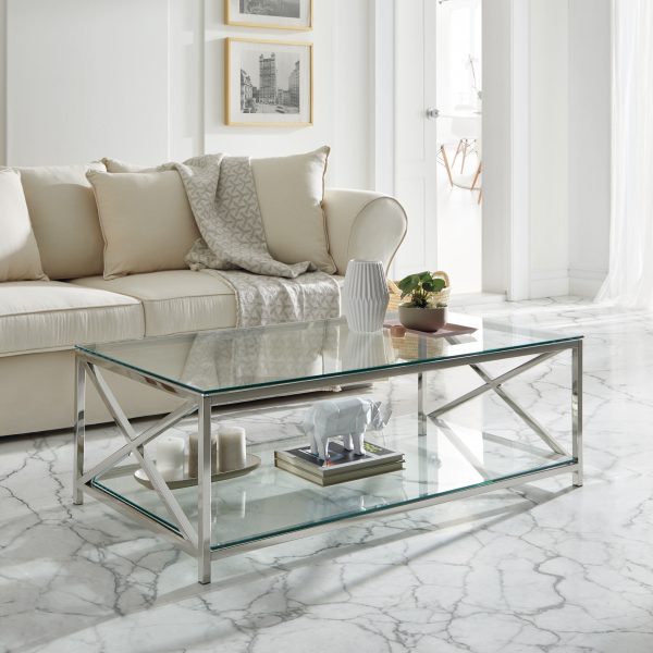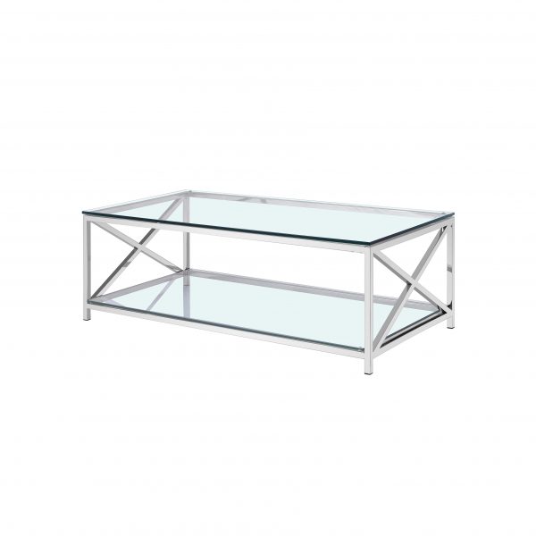 Mesa de centro de cristal templado 10mm. Estructura de acero inoxidable.