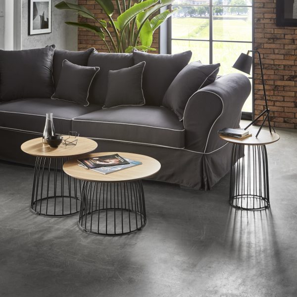 Mesita auxiliar chapada en roble. Patas de metal pintado.
