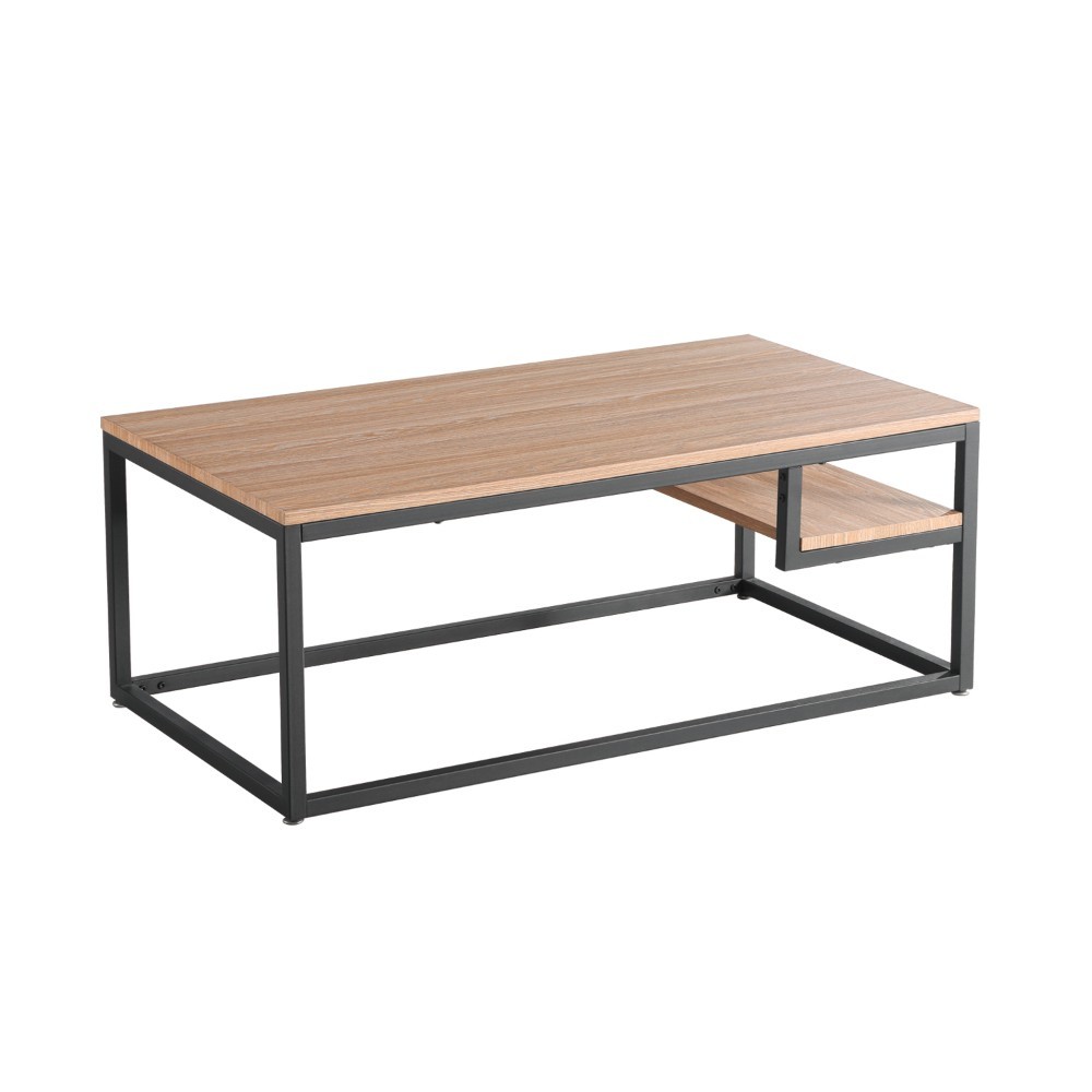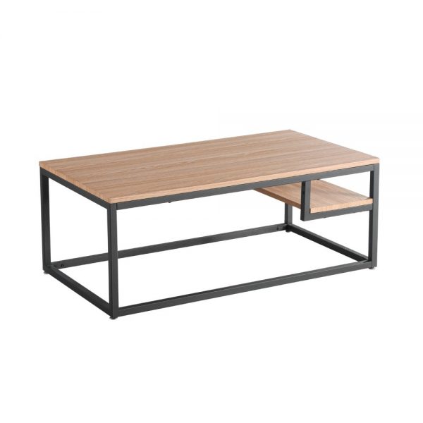 Mesa de centro con tapa de MDF y patas metálicas.