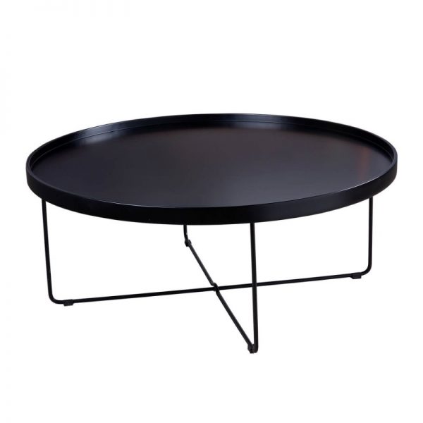 Mesa de centro redonda de gran capacidad, fabricada con la base de metal a juego y una tapa diseño bandeja, fabricada en DM lacado de 40mm grueso y rebajado.
