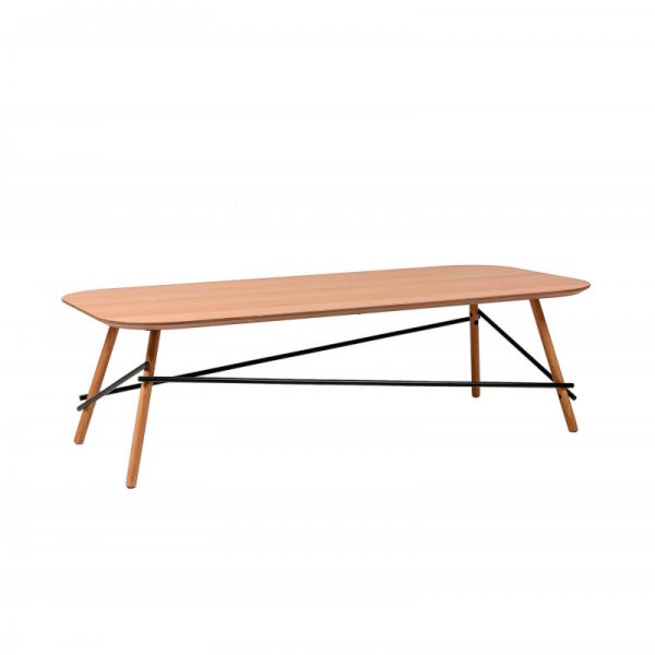 Mesa centro rectangular en roble. Tapa en chapa con cantos redondos y tensores de metal negros.