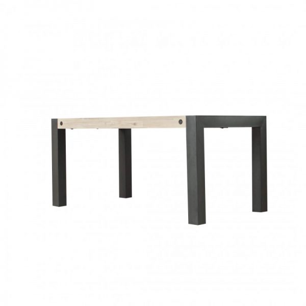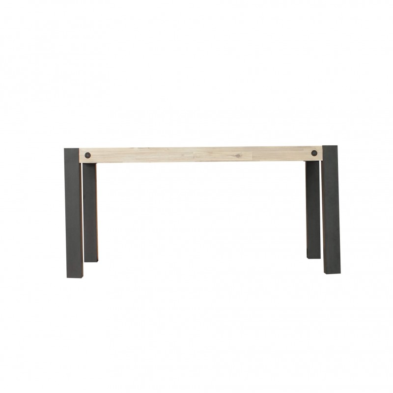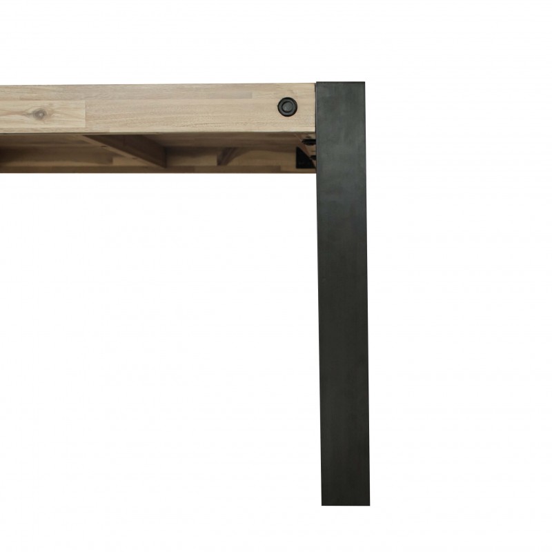 Mesa comedor fija diseño industrial con tapa de madera de acacia y efecto grueso 50mm. Patas metálicas de 90mm. Tapa con refuerzos en su parte inferior para mayor robustez y rosca embutida efecto industrial.
