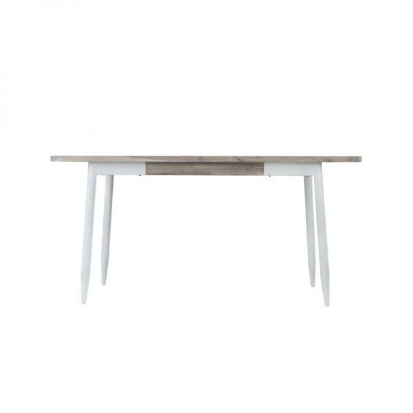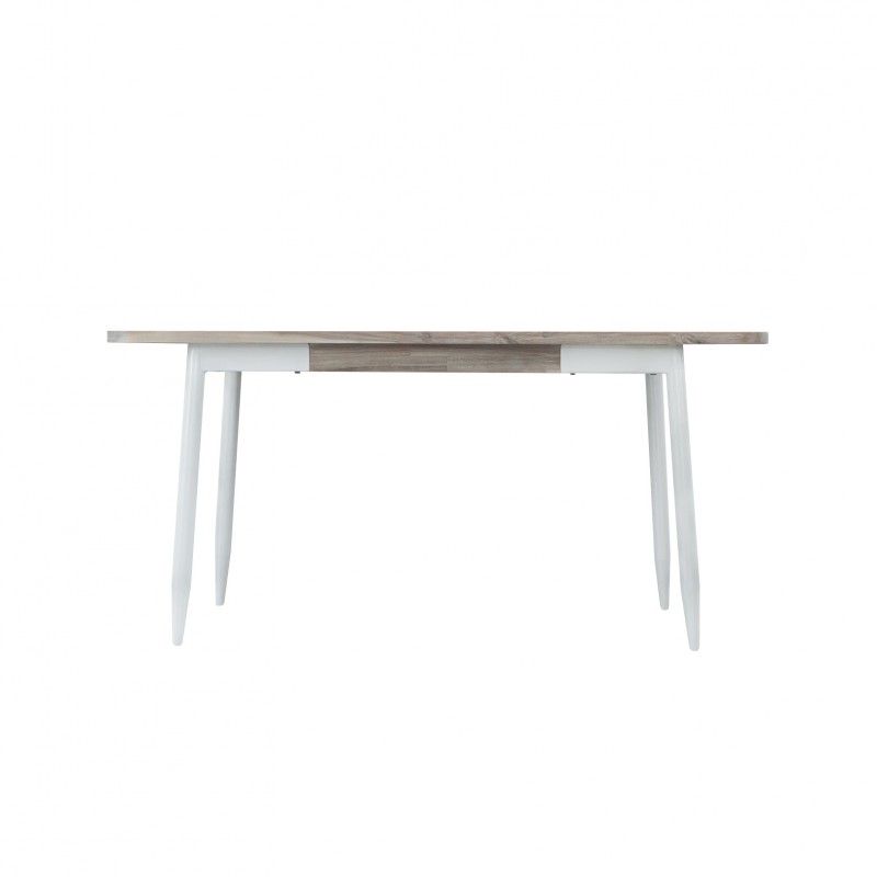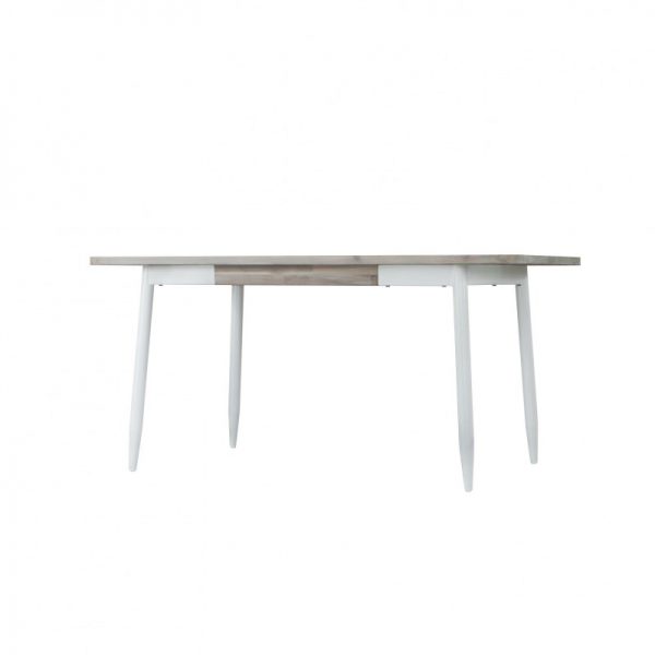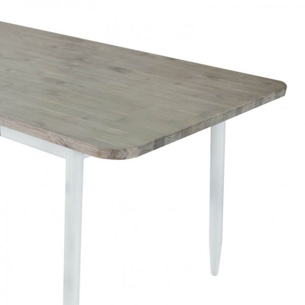 Mesa comedor fija con tapa madera maciza acacia y patas metálicas lacadas blancas. La tapa de la mesa listones de madera 30mm grueso y refuerzos en su parte interior para mayor robustez. Estructura metálica. Patas ø50mm.
