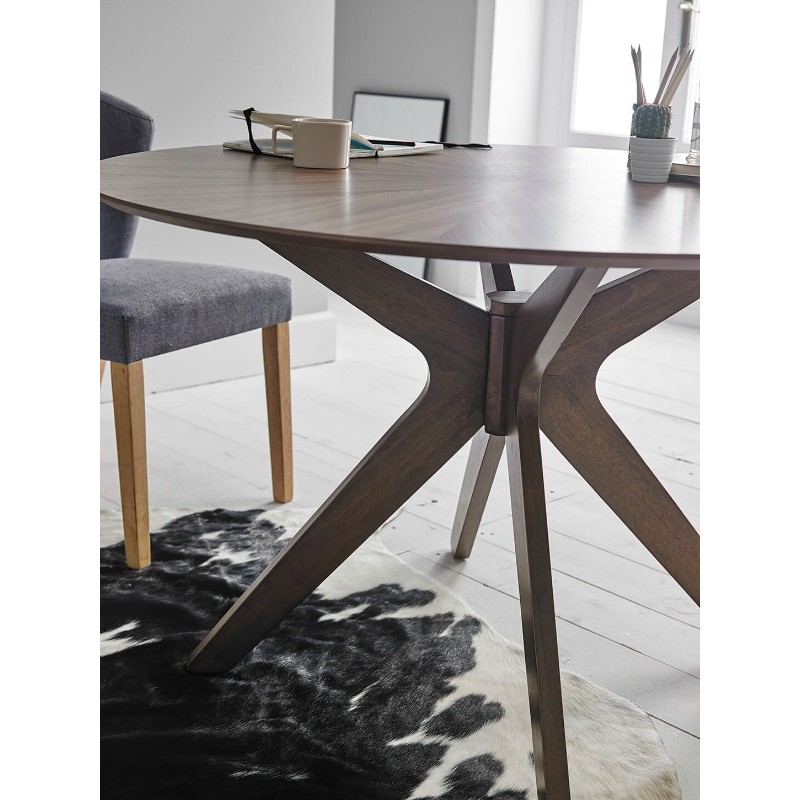 Mesa de madera de 120cm de diametro con estructura y tapa acabado en nogal/roble de 18mm de espesor.