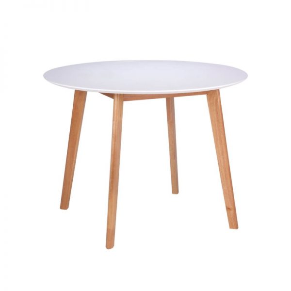 Mesa de madera con forma redonda de 100cm de diametro. Patas fabricadas en madera de caucho y tapa fija lacada en blanco de 18mm de espesor.
