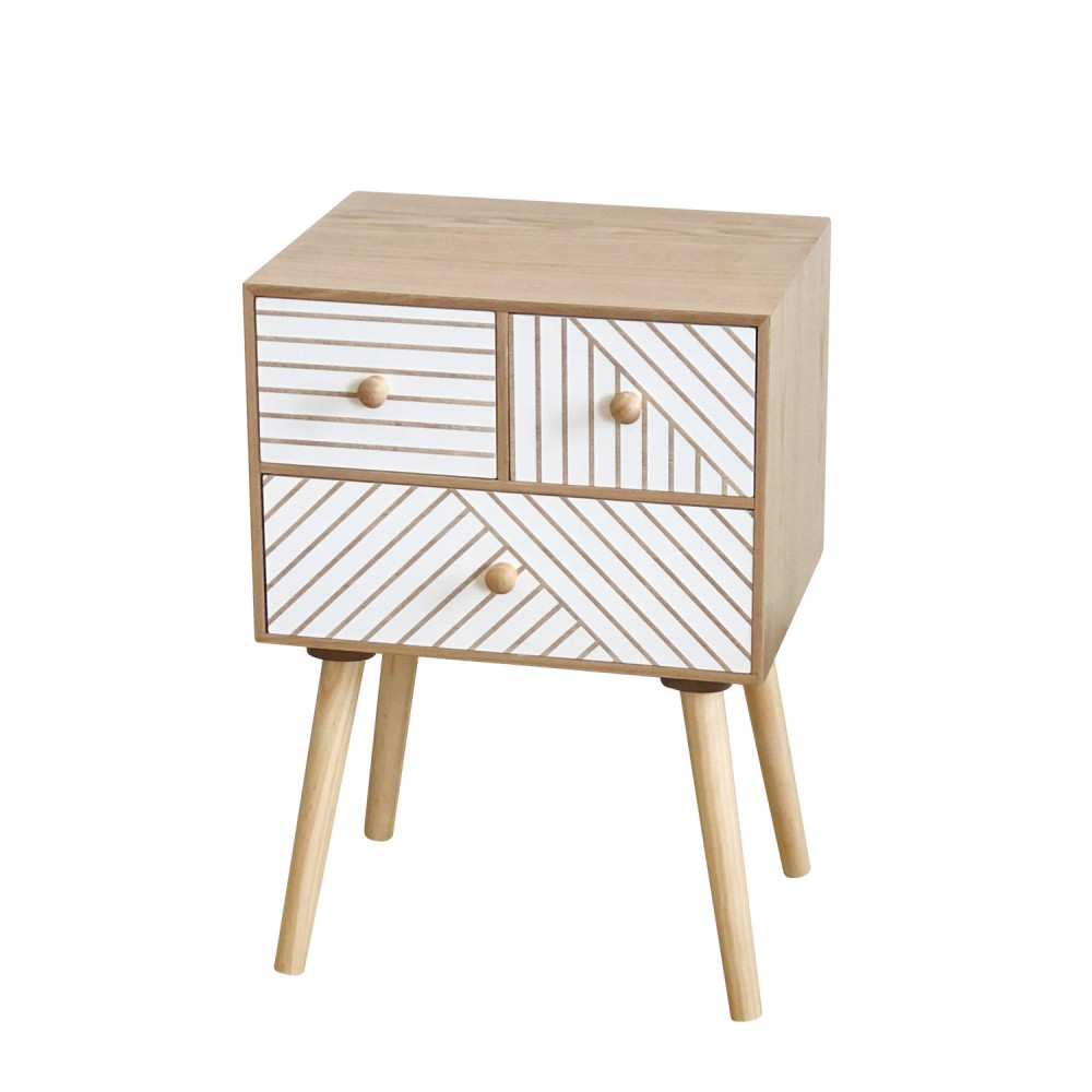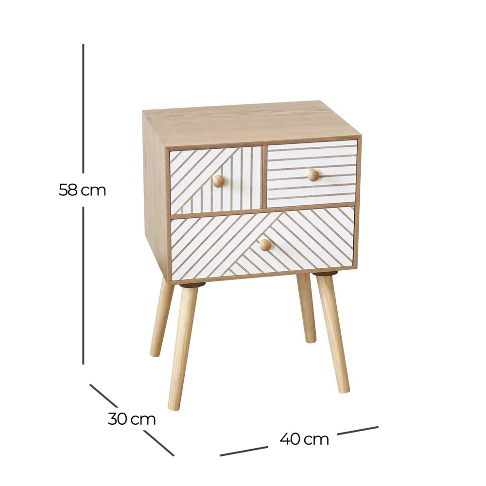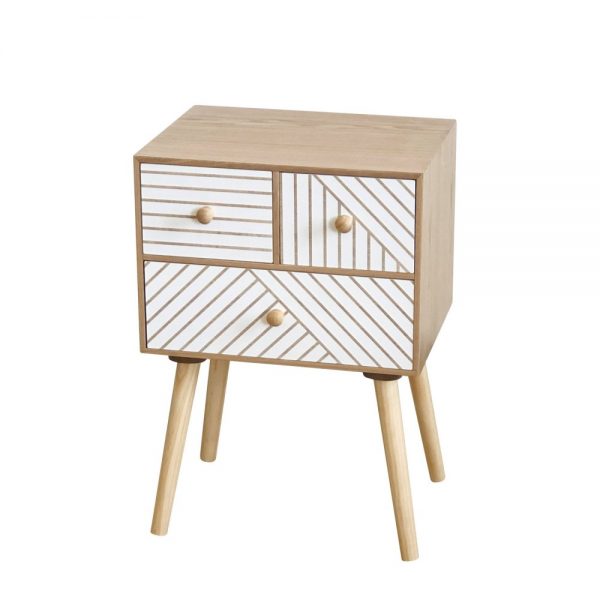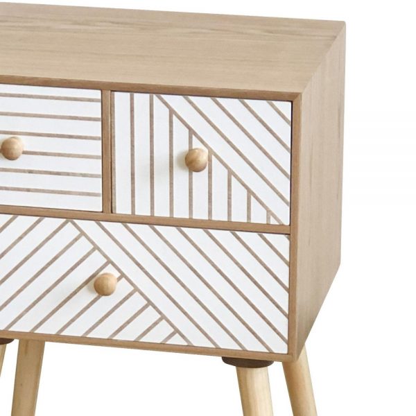 Mueble fabricado en MDF contrachapado con madera natural de Fresno color blanco-pino con patas de pino.