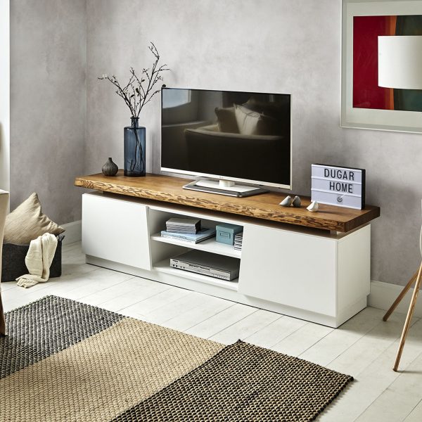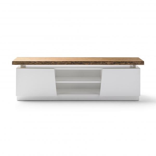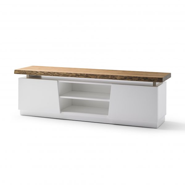 Mueble TV configurable cuerpo en blanco o negro y tapa de fresno con acabados en natural, caramel y habana.